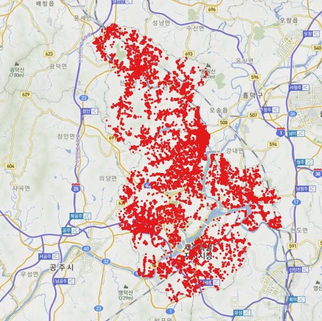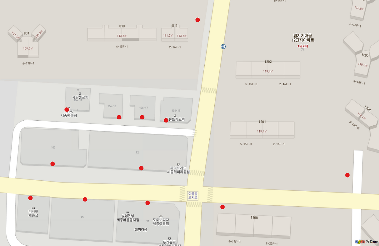 <DAUM 지도와 주소 위치(주된 출입구, 빨간색 점)의 중첩 결과 : (좌) 세종시 전체, (우) 일부 지역 확대>