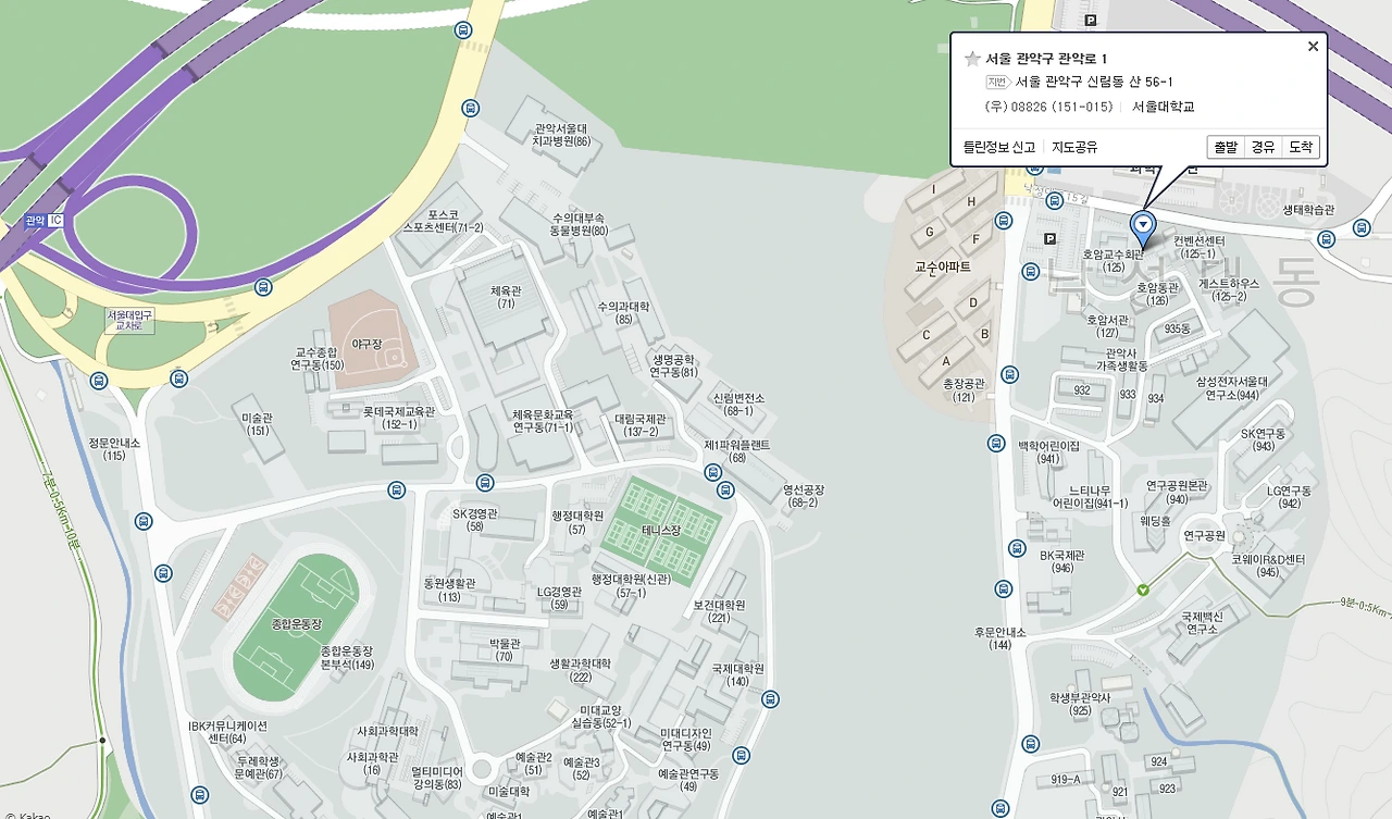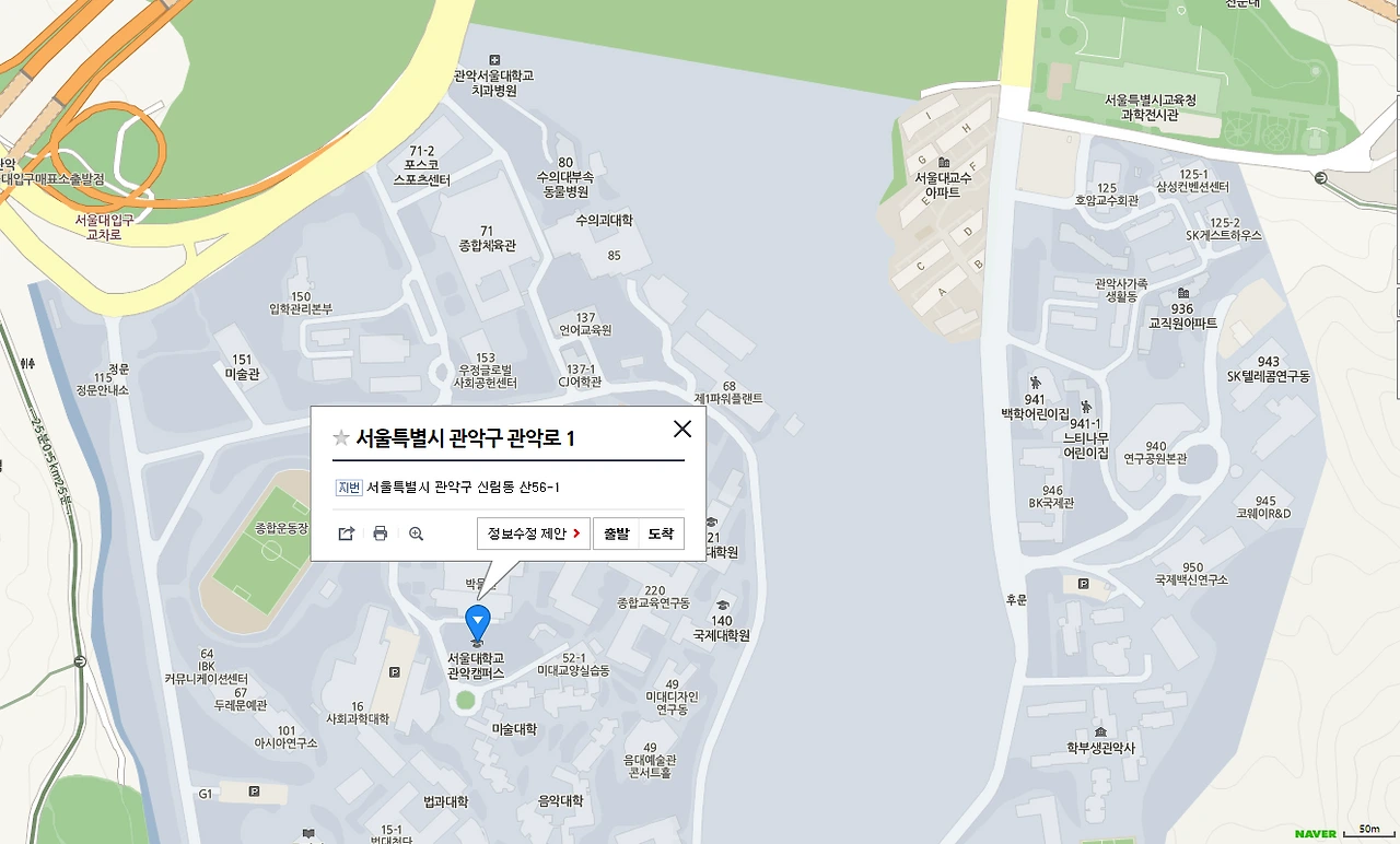 <DAUM 지도(좌)와 NAVER 지도(우) 상의 동일 주소(서울특별시 관악구 관악로)에 대한 상이한 위치>