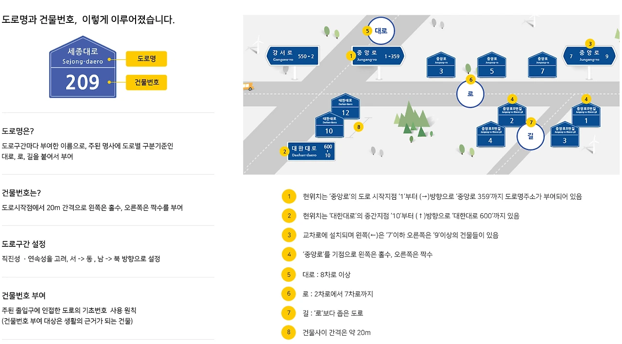 주소는 "서울특별시 관악구 관악로 1"과 같이 문자로 된 것이지 지리 좌표, 즉 위치가 있다는 것에 의아하게 생각이 될 거다. 우리나라에서 주소와 관련된 법은 "도로명주소법(행정안전부고시, 2017.7.26.)"이 있다. 여기에 도로명주소는 도로명, 건물번호, 상세주소라고 정의되어 있으며, "도로명주소법 시행령(대통령령 제 28211호, 2017.2.26)"에는 도로명주소의 구성요소를 정의하고 있다.