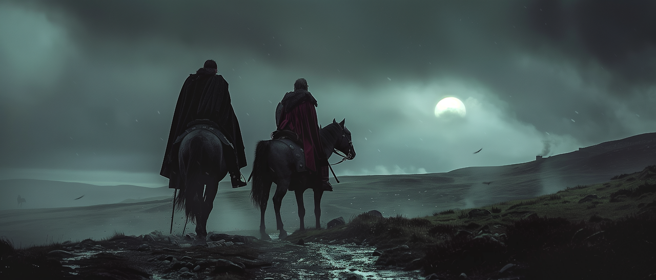 /imagine 프롬프트: 말을 탄 맥베스와 뱅코가 마녀의 예언을 논의하는 시네마틱 샷, 어두운 구름 사이로 비치는 희미한 달빛, 안개 낀 스코틀랜드 고원, 강렬한 표정, 역사적으로 정확한 갑옷과 무기, 빛과 그림자의 극적인 대비, 매우 섬세하고 회화적인 리얼리즘, --ar 21:9 --v 6.0.