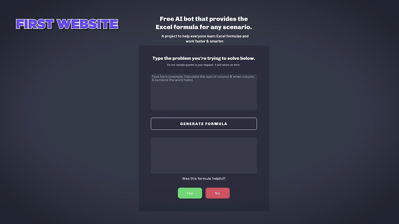이 사진이 처음 만든 웹사이트 버전입니다. 처음에는 프롬프트를 심어둔 간단한 GPT Wrapper 형태였네요. 엑셀 사용 중에 궁금한 함수가 있으면 질문해서 적절한 함수와 사용법을 알려주는 방식으로 시작했습니다.