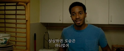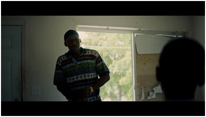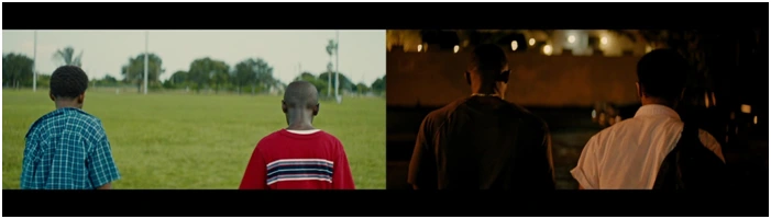 후안 역시 아래에서 올려다보는 앵글이지만 한 장면에서 독립적으로 나오던 엄마와는 달리, 샤이론의 옆에 붙어서 같은 방향을 향해 고개를 돌리고 있다. 이는 동반자이자 롤모델을 나타낸다. 후안에게서 느껴지는 것은 중압감이 아닌, 존경의 의미라 할 수 있다.