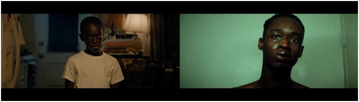 샤이론의 시점: 샤이론의 감정, 과거를 직접적으로 보여주는 요소다. 흑인이자 동성애자, 미혼모의 자식인 샤이론이 사회로부터 배제당하고 따돌림 당하는 모습을 제 3자의 시점이 아닌, 1인칭 시점으로 표현한다. 과거에 대한 언급도, 심리에 관한 대사도 없으나 우리는 이 시점을 통해 샤이론의 감정을 이해할 수 있게 된다.