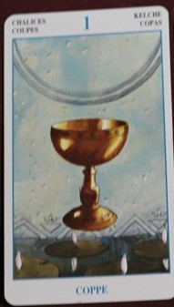 컵에이스는 연못 위에 비어진 것으로 추측되는 컵이 부유하고 있습니다. 바로 아래에 물이 있음에 불구하고 컵에는 아무 것도 담겨있지 않은데, 이 것에 대해 물(감정)은 담기는 곳에 영향을 받아 모양이 바뀐다라고 생각됩니다.