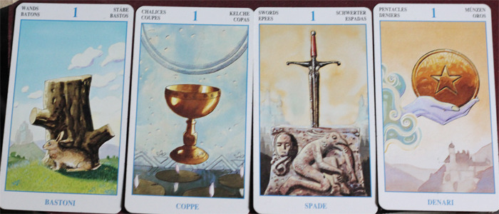 에이스는 시작이자 마이너카드에서 힘의 원천을 상징하며, '도구'의 의미를 가집니다. 또한 각 슈트(속성)가 가지고 있는 의미를 대표격으로 보여주는 역할을 합니다. 각 슈트의 중요인물인 킹,퀸,나이트,잭(네이브) 4명이 힘의 원천(에이스)을 어떻게 다루느냐 역시 해석에 중요한 영향을 끼칩니다.