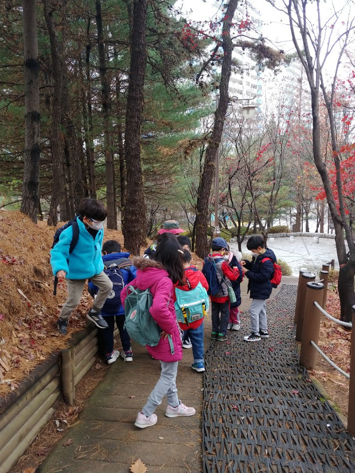 산행길 입구의 공원에서 모이는데, 입구를 찾느라 약간 늦었다. 선생님과 통화하며 두리번거리는데 횡단보도 건너 산기슭 능선에 아이들 머리가 보였다. "와! 이성이다!" 누군가가 소리쳤다.