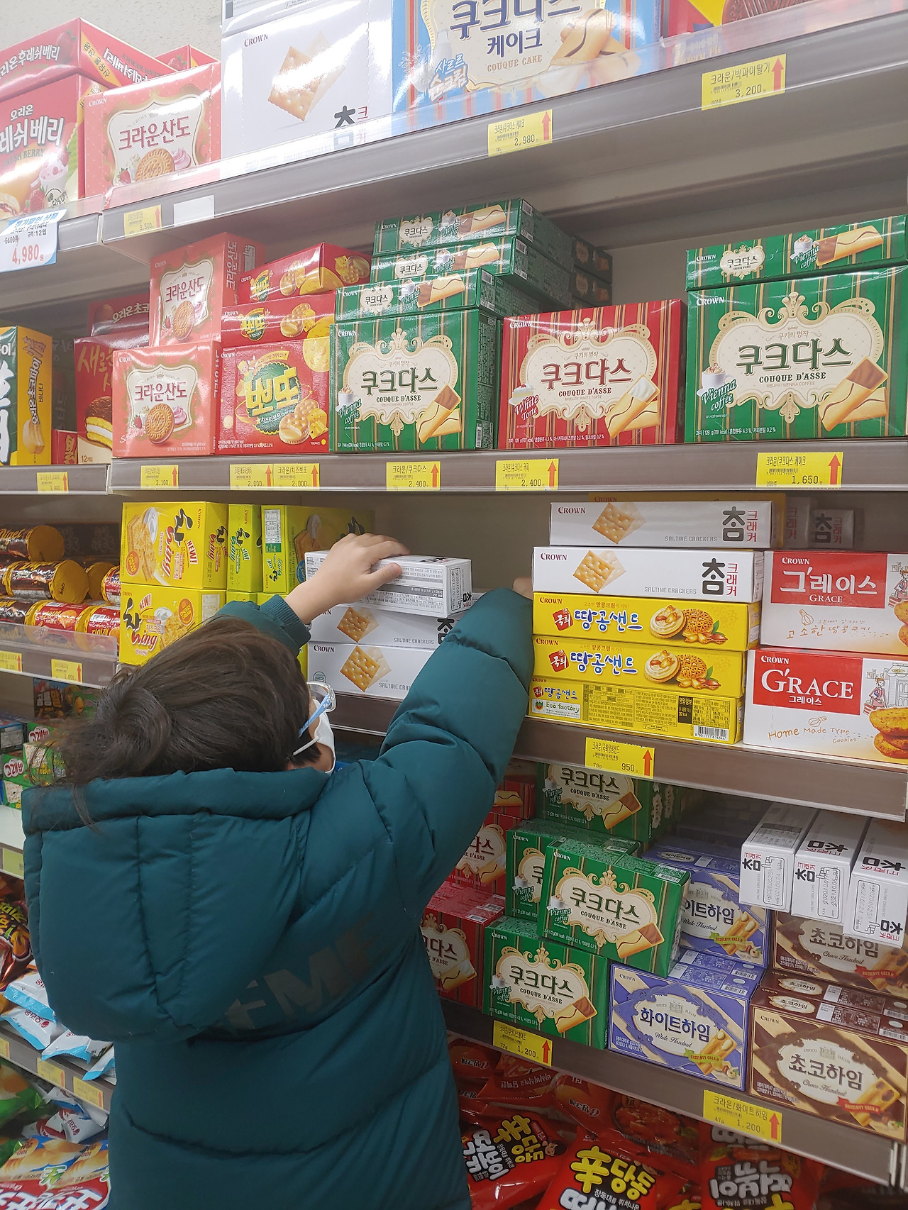 직원에게 확인하고 찾는 게 없음을 확인한 이성이는 아쉬워하는 기색 없이 다시 고르기에 열중한다. 마시멜로 없는 코코볼 중에서 유통기한 제일 긴 것을 골라 바구니에 넣는 것이다.