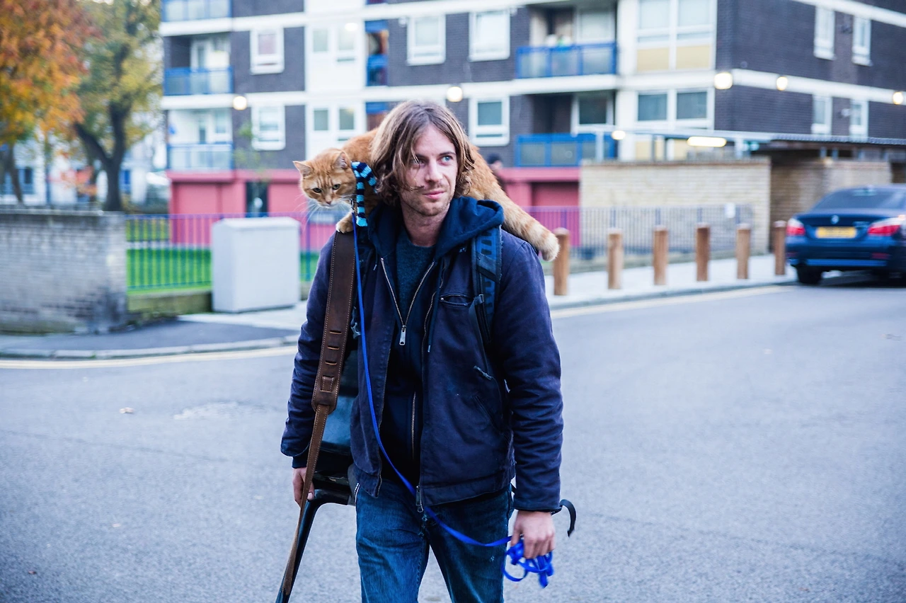 2. 주인공인 제임스 못지않은 역할을 한 고양이는 실제 사연의 주인공이 맡았다. 고양이의 눈높이와 시선으로 카메라가 자주 움직이는데 당당한 배우로서의 비중을 느끼게 한다. 실제 고양이의 연기는 CG를 많이 사용하는 요즘 분위기와 대조를 이뤘고, 오히려 참신하게 여겨졌다. 문득 어릴 적 보았던 강아지 주연의 영화 <벤지>(1974)가 떠오르기도 했다.