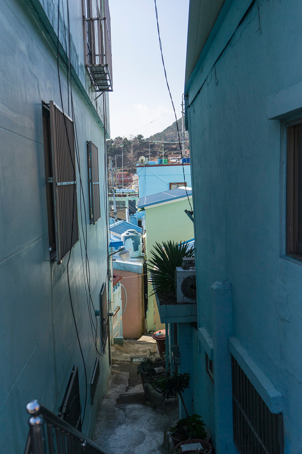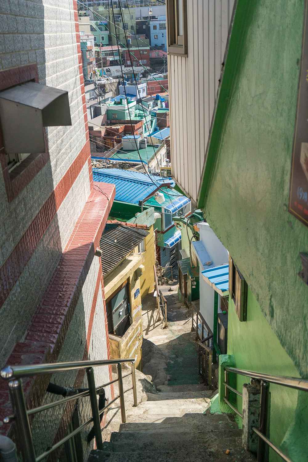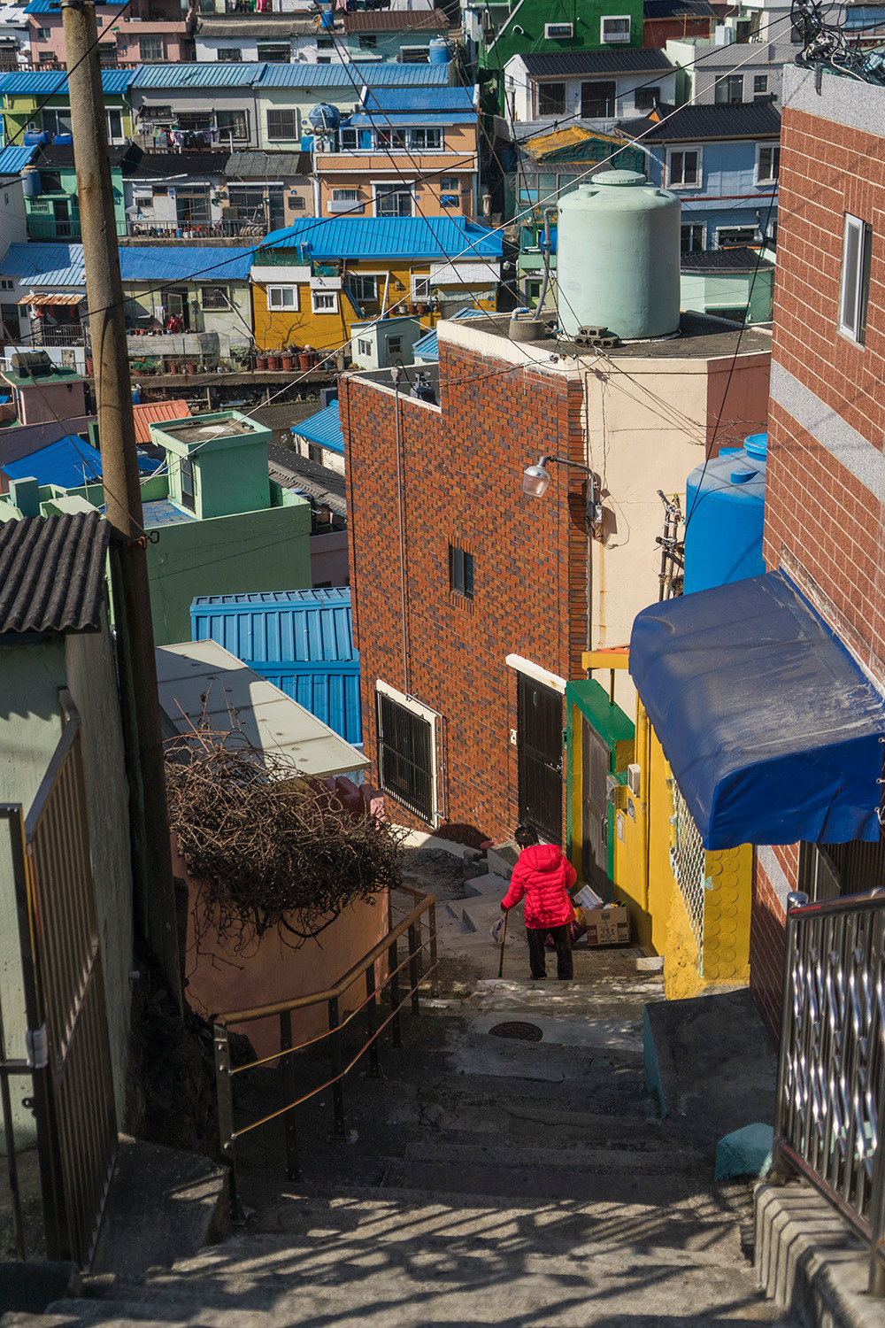 부산의 산자락에는 산복도로라는, 산의 중턱을 지나는 도로가 있다. 이 도로 주변으로 집들이 계단식으로 자리 잡았다. 집들 사이로 비좁은 골목이 생겨났다. <감천문화마을>은 이 집들과 골목길이 만들어낸 이국적 경치로 관광명소가 되었다.
