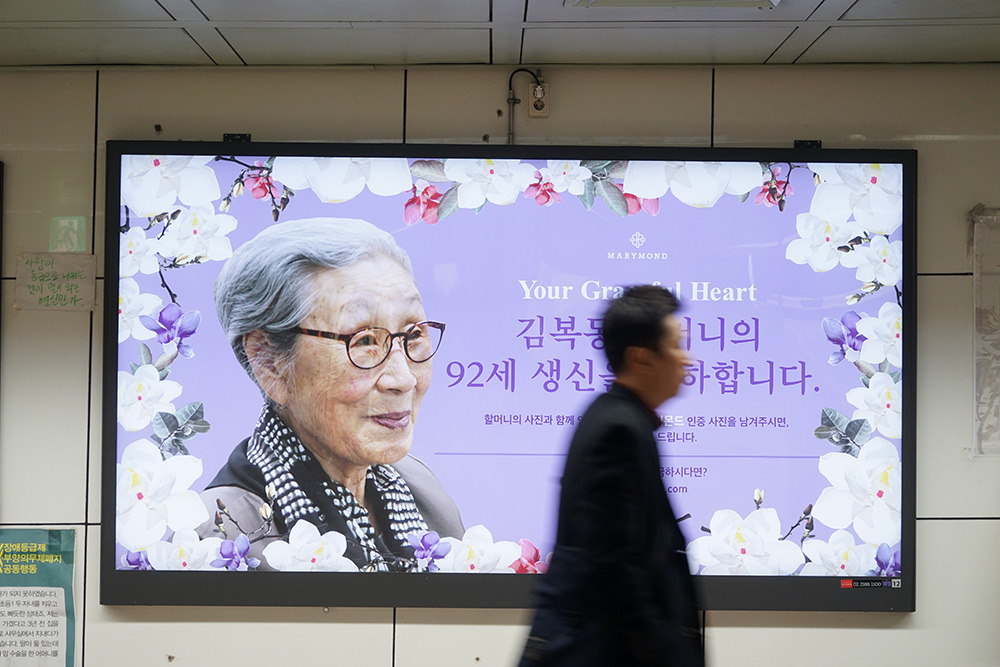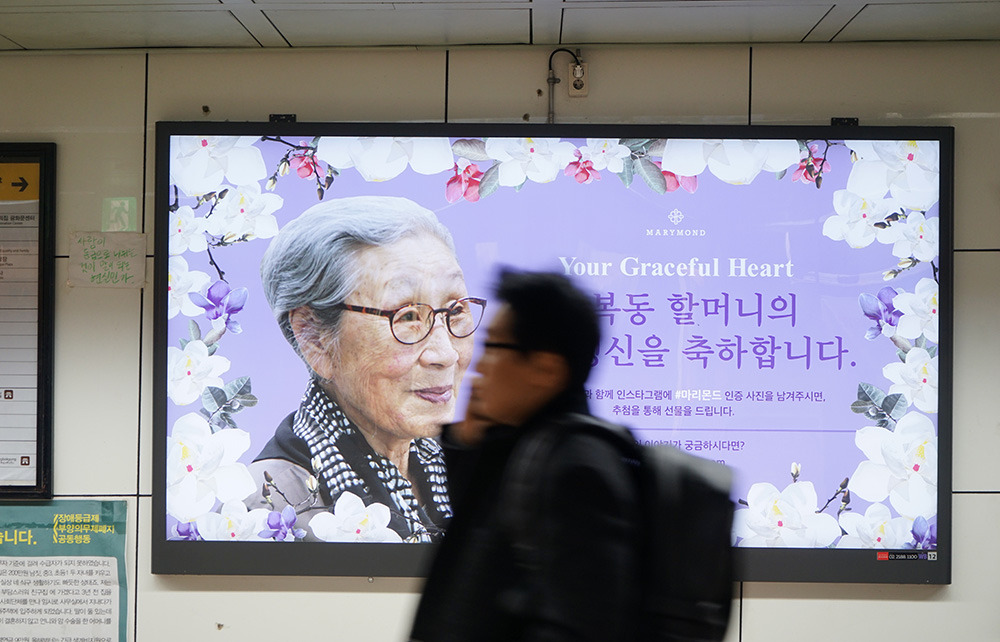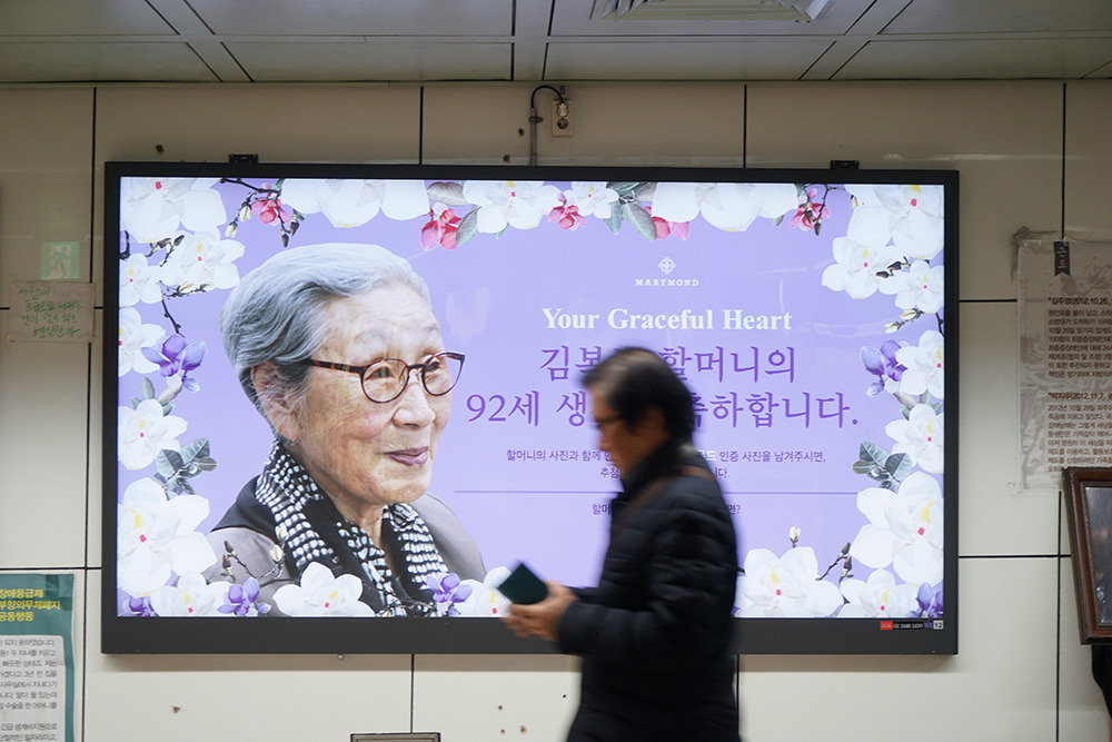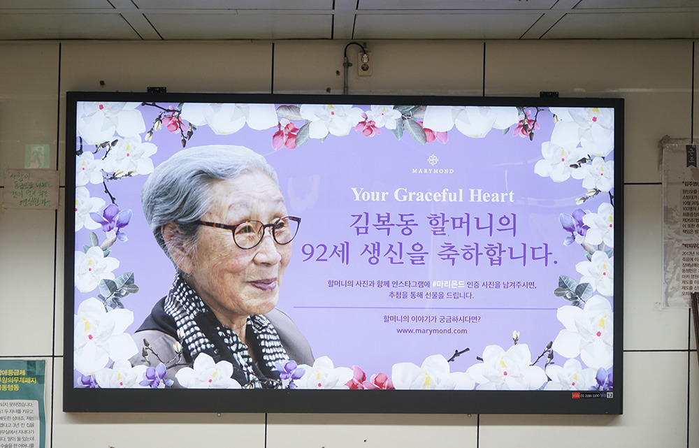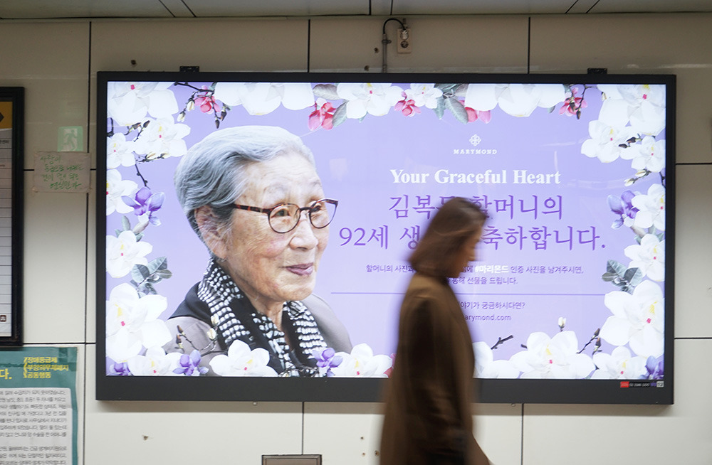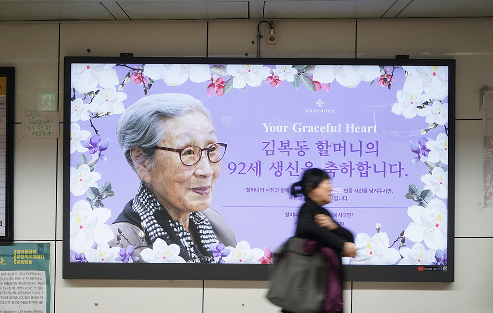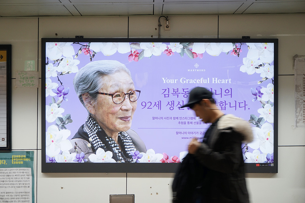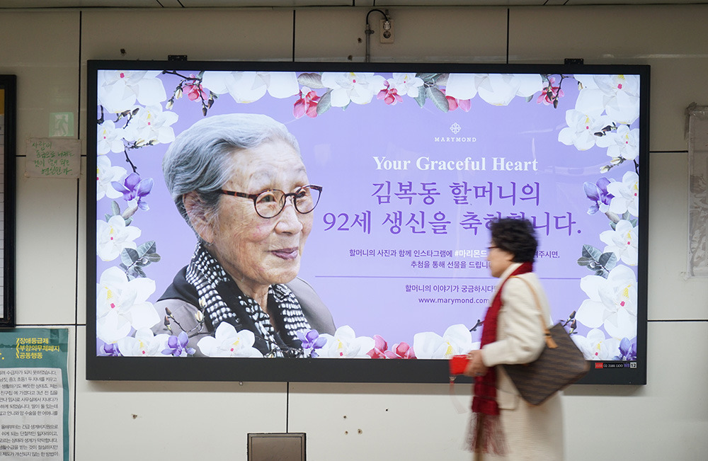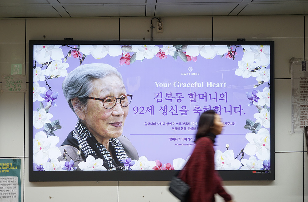 광화문역과 강남역에 일본군 위안부 피해자 김복동 할머니의 생신을 축하하는 광고판이 등장했다. "김복동 할머니의 92세 생신을 축하합니다"라는 문구가 적혀있다. 보라색 배경에 할머니를 상징하는 목련이 활짝 피었다. 목련의 꽃말은 '숭고한 정신', '우애'이고, 백목련의 꽃말은 '이루지 못한 사랑'이다.