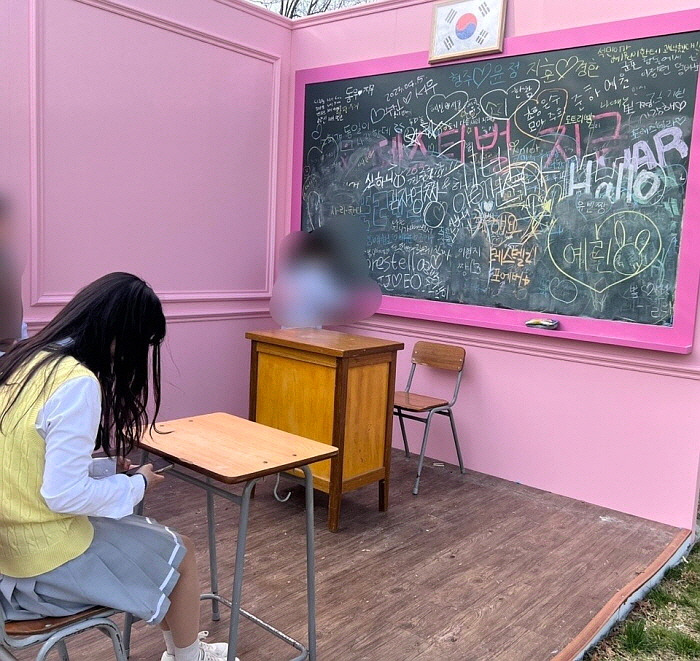 교실 포토존에는 책상과 의자가 줄 맞춰 놓여 있었고, 교탁과 칠판이 있었다. 교실의 벽면은 나한테 익숙한 색이 아니었지만, 책상과 의자는 익숙한 색과 질감이라서 반가웠다. 의자에 앉아 책상을 보고 있으니, 청소년의 내 모습이 더 잘 떠올랐다. 분필로 칠판에 글자를 적을 때는 떠든 사람을 쓰고 있는 반장 중학생의 나와 쉬는 시간에 칠판에 낙서 하는 나 그리고 수업 시간에 칠판 위에다 문제를 풀 때마다 괜스레 발가벗겨진 것 같아 기분이 좋지 않았던 내가 생각났다.