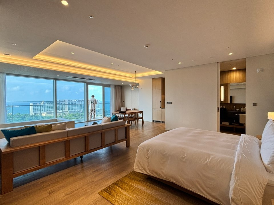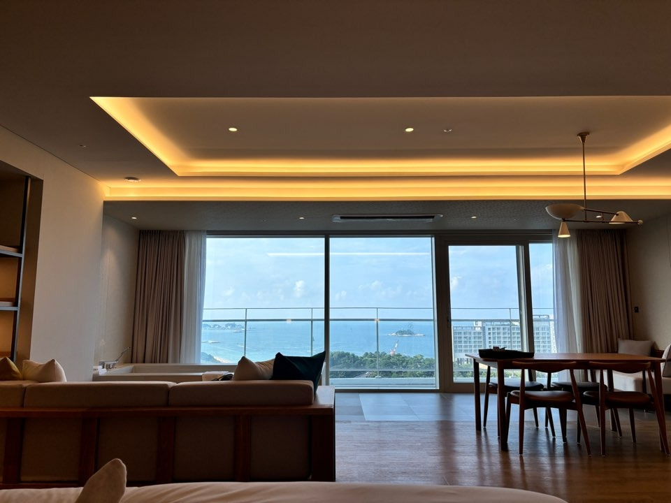 창가를 마주 보는 쪽에는 침대, 소파와 테이블, 자쿠지가 있었다. 모두 통창을 통해 바다를 감상하기 좋은 방향으로 배치되어 있었다. 흥미로웠던 점은 창가에 있던 소파, 객실 안에 있는 자쿠지, 창과 마주 본 위치에 있었던 큰 소파, 침대까지 각각 어디서 보냐에 따라 바다뷰가 조금씩 다르게 보였다.