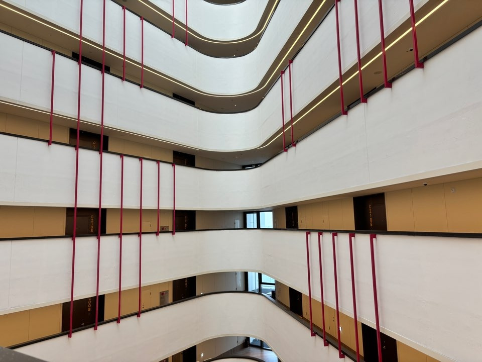 각층의 복도들이 한눈에 보였는데, 화이트의 벽면과 위에서부터 아래로 쭉 뻗어나간 빨간색의 파이프가 눈에 들어왔다. 여기에 모서리가 곡선으로 되어 있어서 예술작품을 보는 듯했다. 뒤에 보이는 짙은 우드톤의 문과 투박하게 붙여있는 숫자까지 하나의 작품 같았다.