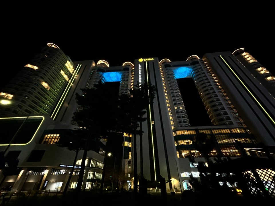 세 개의 타워가 브릿지로 연결되어 있고, 타워 옆에는 엘리베이터가 오르락내리락하는 게 보였다. 그 엘리베이터는 바깥풍경이 보이는 투명 엘리베이터라서 엘리베이터의 조명이 밖에서 보였다. 더구나 양쪽의 엘리베이터가 서로 교차되어 지나가니 영화 속 한 장면 같았다.