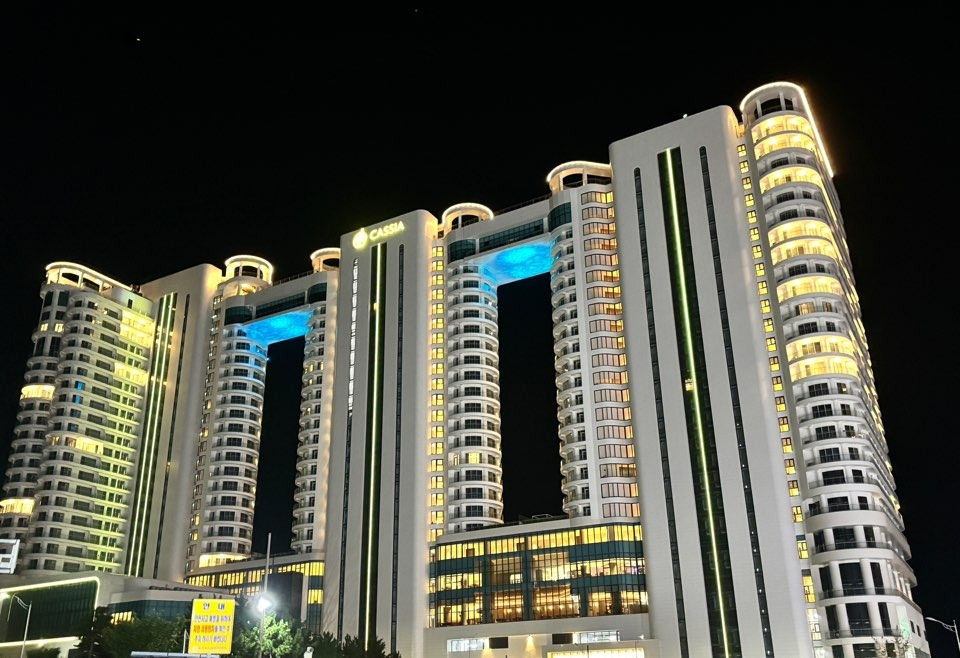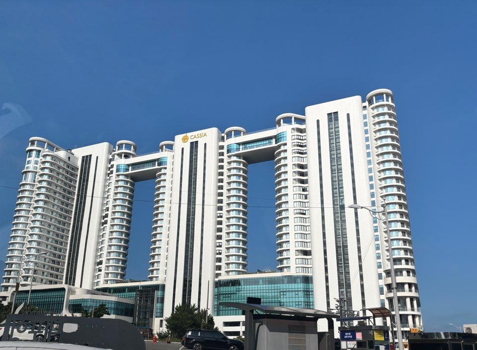 카시아 속초는 지하 2층부터 지상 26층까지 있으며, 717 객실 모두 오션뷰에 다양한 부대시설이 마련되어 있다고 한다. 연면적 3.6만 평 규모 역대급 스케일로 건물은 A동, B동, C동으로 나뉘어 있었다. 이 세 개의 타워는 두 개의 브릿지로 서로 연결되어 있었는데, 그 모습이 마치 그림 같았다. 앞에서 언급한 것처럼 용산의 드래곤시티가 생각나기도 했고, 스쳐 지나가며 봤던 브릿지가 있는 건물들이 떠올랐다. 많이 본 건 두 개의 건물을 연결한 브릿지였는데, 세 개의 건물을 브릿지 두 개로 연결한 건 거의 본 적이 없어서 카시아 속초의 외경이 더욱 색다르게 보였다.