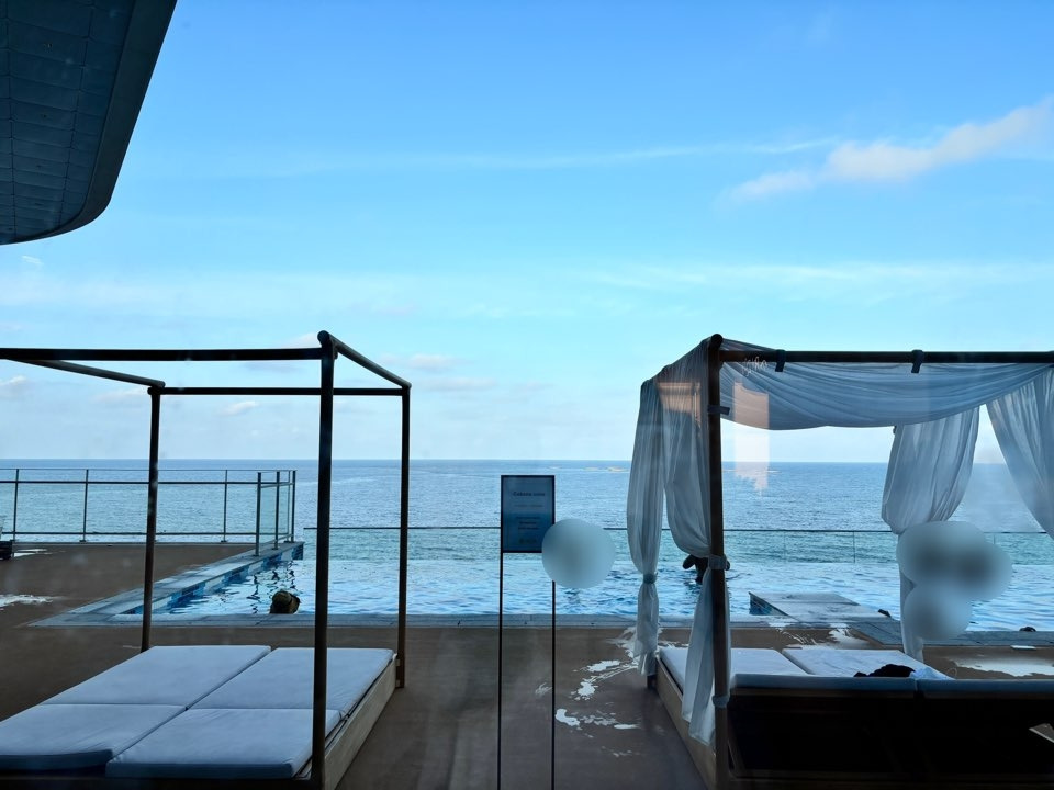 통창을 통해 밖을 바라보니, 기다란 수영이 눈에 들어왔는데 바다를 바라보고 있었다. 모 호텔의 수영장처럼 바다와 수영장이 이어진 듯한 느낌이 들었다. 수영장뿐만 아니라 스파도 있다고 하는데, 우리는 갑자기 온 거라서 수영과 스파는 다음을 기약했다.