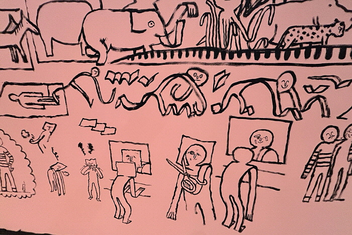 두 번째 테마는 ‘페이퍼 정글’이었는데, 거대한 종이 뱀이 있었다. 종이세상의 뱀은 우리세상의 뱀과 달리 귀여웠다. 순박한 인상에, 색은 코랄 색과 비슷했다. 몸통과 꼬리에는 앞, 뒤로 작가가 직접 그린 벽화가 있었다. 한쪽에는 인간의 역사가 반대쪽에는 종이인간의 탄생기와 사회가 되는 과정이 담겨 있었다.