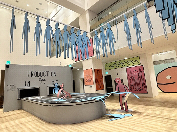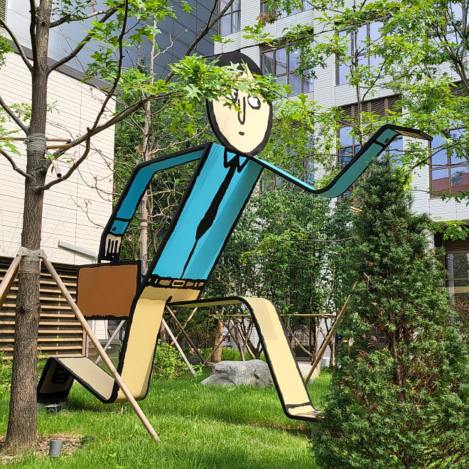 무엇보다 눈에 띄었던 점은 조형물이었다. 곳곳에는 초대형 페이퍼피플들이 있었다. 눈치를 보며 퇴근하는 듯한 모습의 종이인간, 퇴근하는 기쁨의 춤을 추는 듯한 종이인간은 이 동네 특성을 잘 표현했다. 전시회 현수막에도 시계 초침처럼 얼굴이 겹치면서 서서히 표정이 변하는 종이인간은 직장인의 얼굴을 나타내는 듯했다. 전시홀에 입장하기 전부터 종이인간들이 있으니, 그들의 환대를 받으며 종이세상에 들어가는 듯한 기분이 들었다.