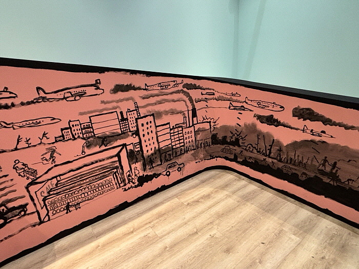 인상적이었던 건, 아무것도 없었던 세상에 동물이 생기고 인간이 태어나면서 문화와 건물 그리고 전쟁의 역사, 현재 모습까지 타임라인처럼 담긴 벽화였다. 마지막에는 온 세상이 까맣게 변하고 아무것도 없는 걸로 보아, 환경오염으로 인간이 살 수 없는 지구를 표현한 듯했다. 반대편의 벽화는 지구 종말 후, 지구 반대편 세상을 표현한 듯 보였다. 자연에서 만들어진 종이인간은 우리가 했던 방식으로 사회를 만들어 나갔다. 지구에서 인간의 삶이 끝나고, 지구 반대편에서 자연이 만든 또 다른 세상이 시작된 거다. 막연하게 지구 종말 후, 자연만의 세상이 될 거라는 생각을 한 적이 있었는데, 이를 눈으로 직접 보니 등골이 오싹해지고, 서글펐다.