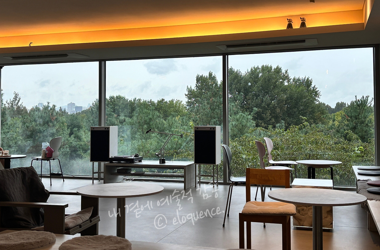 창 앞에는 스피커가 놓여 있었다. 스피커+통창+나무들의 윗부분 전경의 조화를 한눈에 담으면서 카페 주인의 감각에 감탄했다. 그 세 가지 조합은 예술적이었으며, 인테리어 잡지 속 사진을 보는 듯했다. 내가 지금 보고 있는 게 카페 내부와 전망을 보고 있는 건지, 전시회에서 한 작품을 감상하고 있는 건지 헷갈렸다.