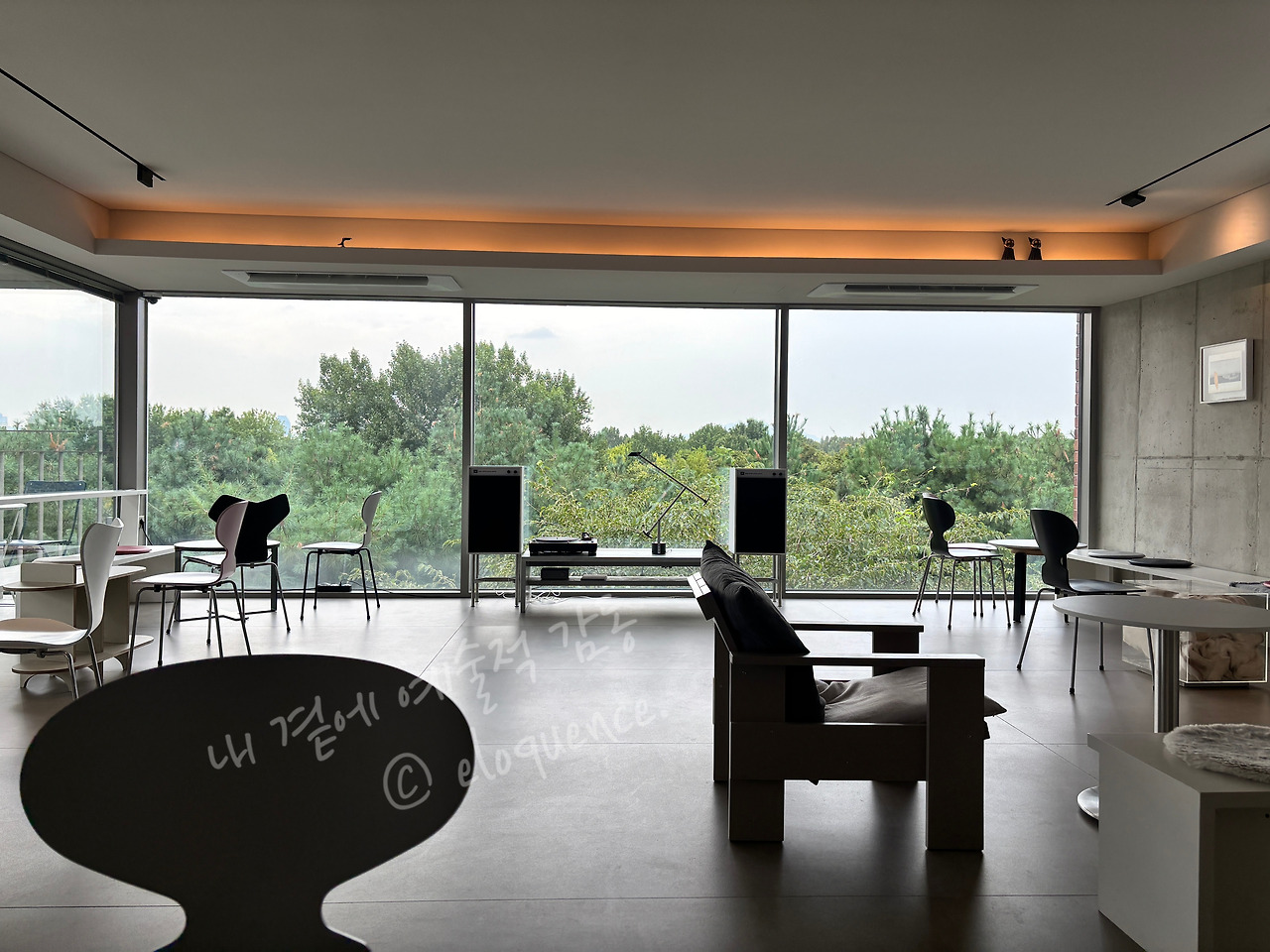 안내문에는 포레스트 라운지, 개인의 한 공간, 누군가의 집, 편안한 무드의 공간이라고 적혀 있었다. 인상적이었던 문장은 '서울숲 큰 나무들 그 위의 시선으로 통창을 통해 보는 전경'이었다.