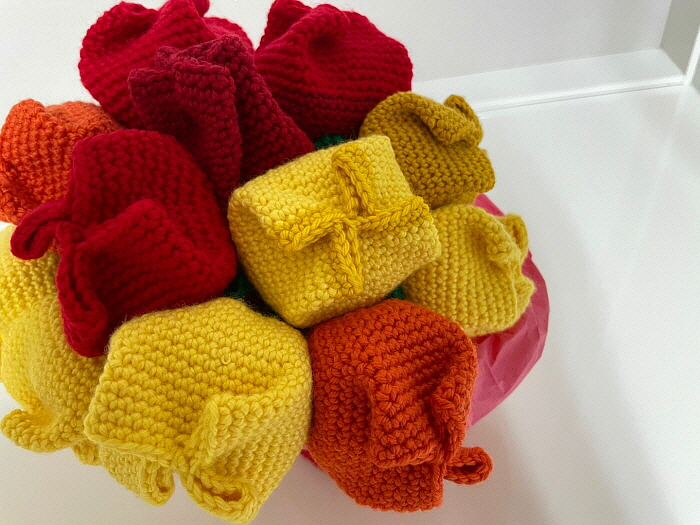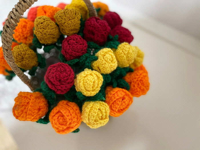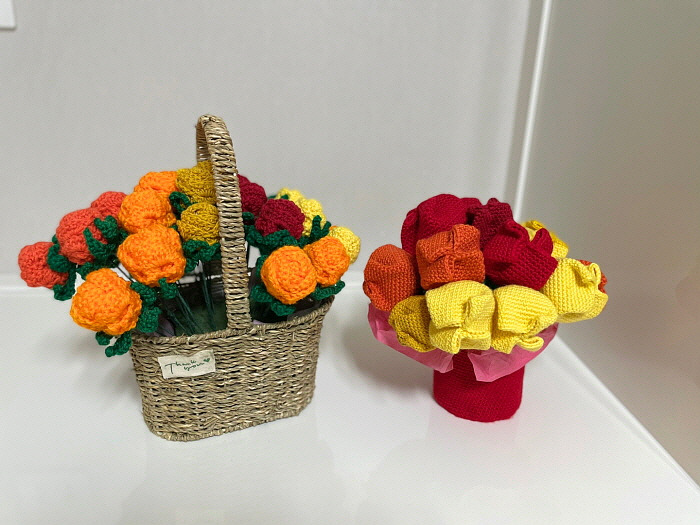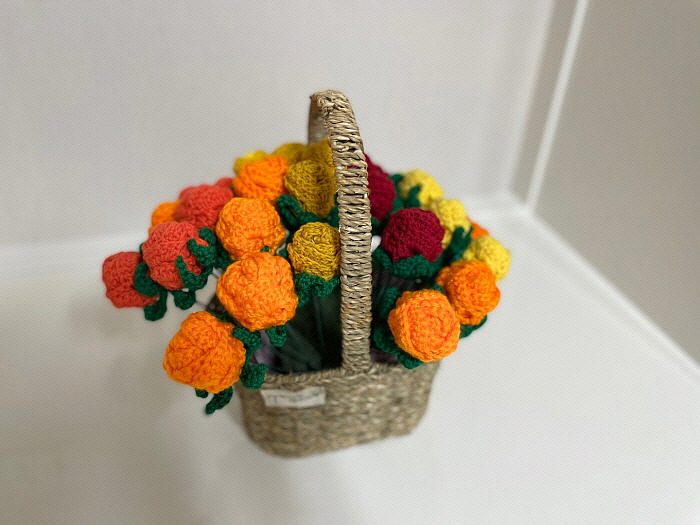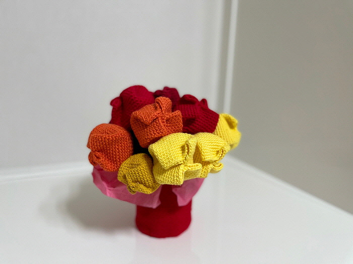 이 꽃도 엄마의 손에서 피었다. 장미꽃처럼 실로 만들었으며 튤립 모양을 잡기 위해 안에 솜을 넣었다고 한다. 한 송이는 맨 위만 진한 노란색으로 했는데 마치 그라데이션을 표현한 것 같다. 꽃다발처럼 종이로 꽃을 감싼 다음 꽃병에 꽂았다. 꽃병에는 실로 만든 빨간 옷을 입혀줬다.