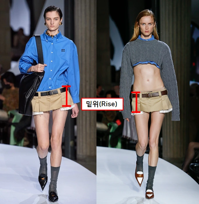 *밑위(Rise)란 허리선부터 가랑이까지 길이를 의미. 따라서 Low Rise는 그 길이가 짧고, High Rise는 그 길이가 길며, Hight Waist 라고도 지칭