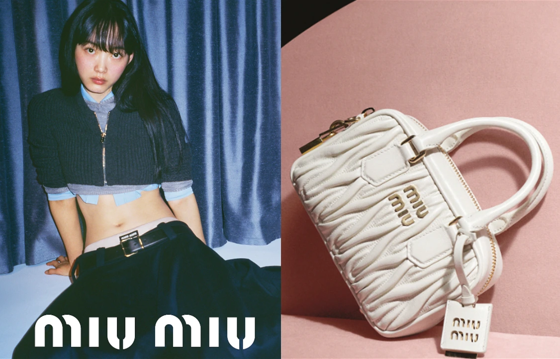 (좌)미우미우 니트&셔츠, (우)마틀라세 나파가죽 탑 핸들 백 / 출처 : 미우미우 홈페이지