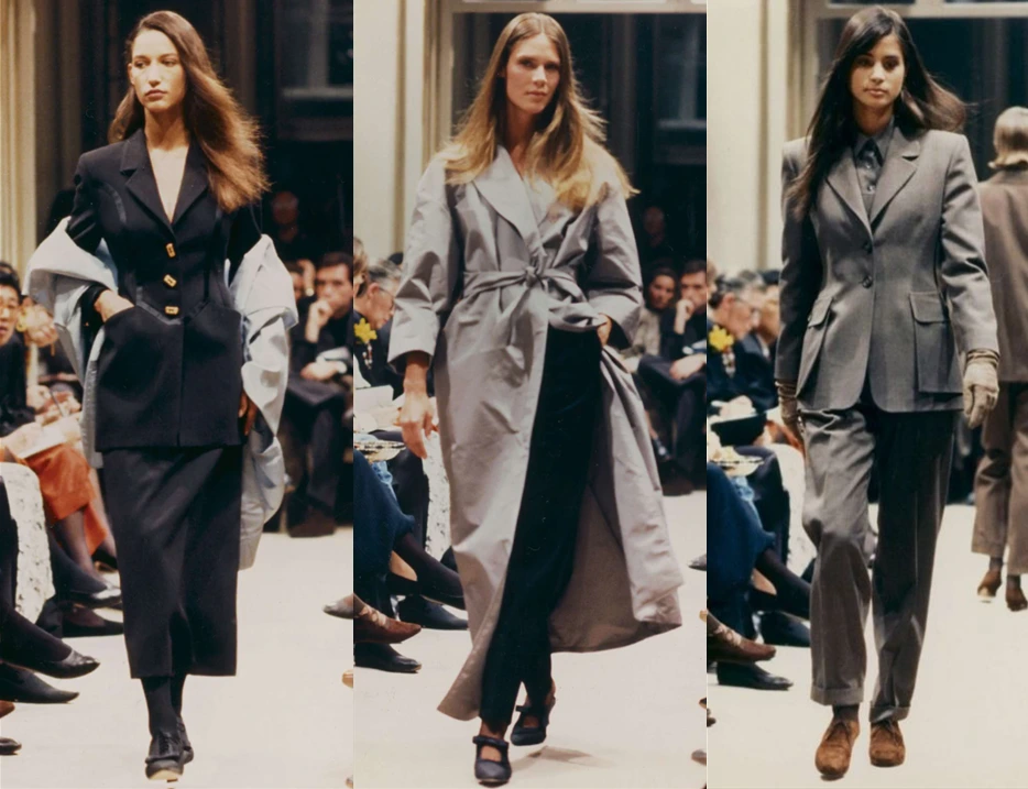 프랑스의 (올드) 셀린느가 있다면, 이탈리아에서는 프라다가 우아하고 실용적인 미니멀 룩을 만들었습니다. 30대 여성들(직장인, 워킹맘 등)들이 편하게 입을 수 있되, 심플하고 고혹적인 여성복 라인을 1988년에 런칭하죠. 단순히 심플함과 엘레강스만 강조한 것이 아니라 본인만의 색깔을 함께 채색합니다. 여성복과 거리가 있는 밀리터리 요소를 도입하기도 하고, 공산주의 마오쩌둥에서 영감을 받아 디자인 하는 등 그녀만의 색채를 은은하게 녹이며 프라다만의 영역을 구축하죠.