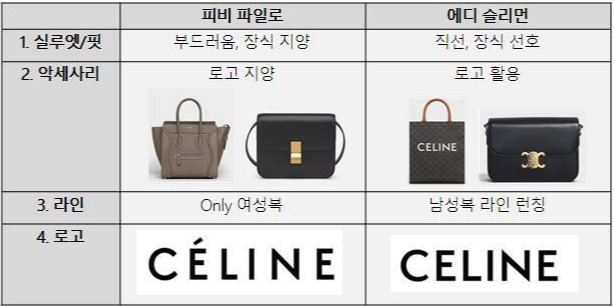 (좌) 피비 파일로의 셀린느와는 넉넉(편안)하고 부드러우며, (우) 에디 슬리먼의 셀린느는 슬림하고 관능적이다.