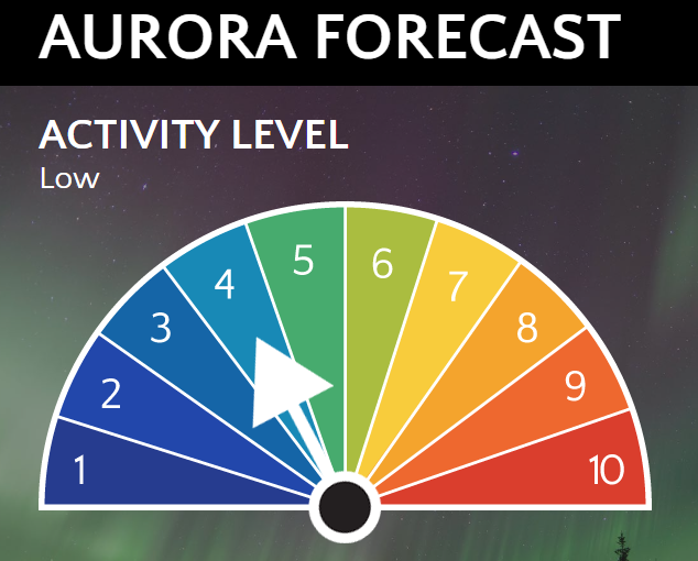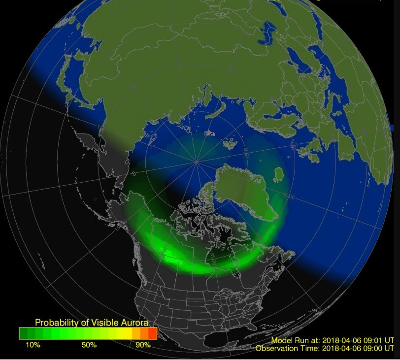 <여기서 잠깐 오로라 관측에 사용했던 도구를 소개한다. 우리는 auroraforecast.com이라는 웹사이트를 통해서 오로라의 세기와 관측 가능성을 판단했다. 전문적인 도구는 아니지만, 현재 오로라가 지구 북반구에 어디에 위치해 있는지, 강도는 어떠한지를 대강은 알 수 있다. 아래 그림을 보면 현재 2018년 4월 5일 기준으로 오로라 레벨은 4/10이며, 알래스카와 화이트호스를 시작으로 캐나다 북부 일대와 동쪽 대서양과 그린란드까지에 걸쳐 퍼져있는 것을 알 수 있다. 통상 레벨 4 정도면 조금 약한 수준이지만 관측은 가능하다. 우리가 있었던 5일 동안의 화이트호스는 3에서 6을 오갔다.>