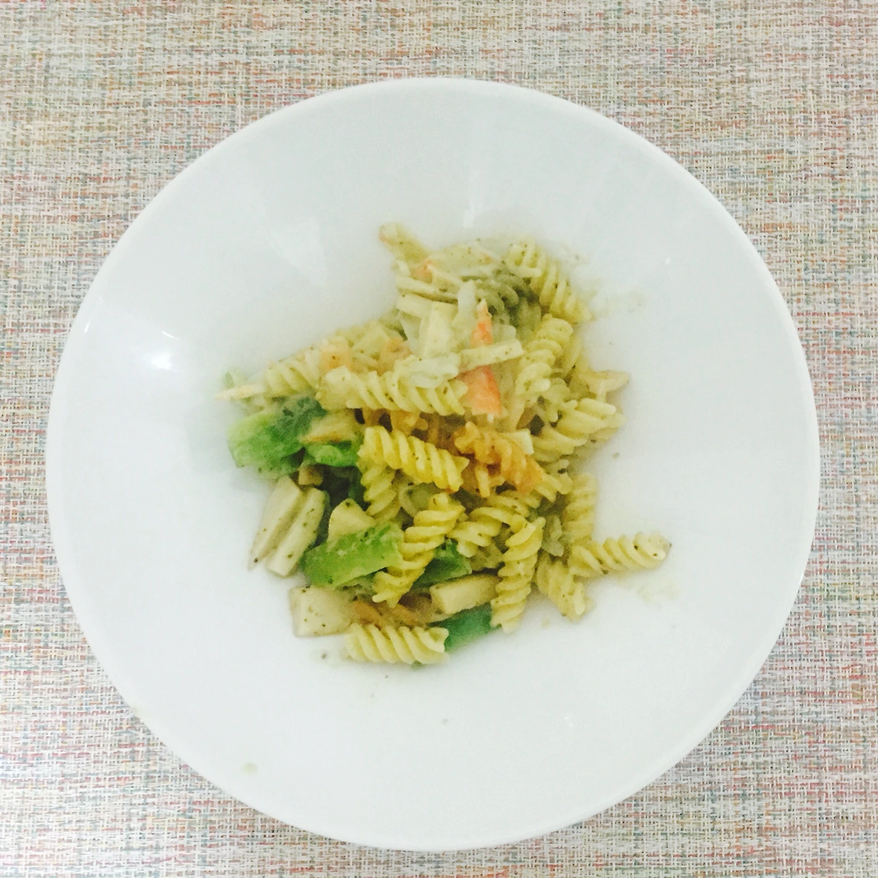 7. 구워지면 바질페스토 소스를 넣고 함께 섞어 볶는다. 이 때 게맛살을 함께 넣는다.
