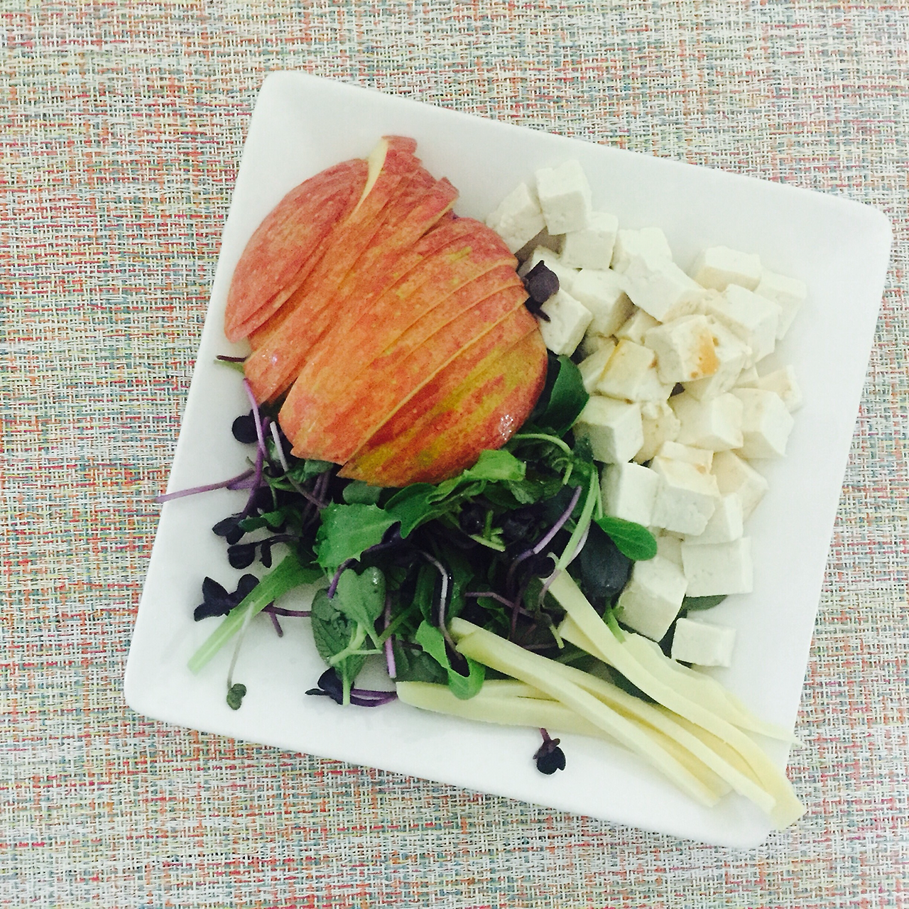 5. 채소를 놓고 고다치즈 조금 썰어놓고 사과도 놓는다.