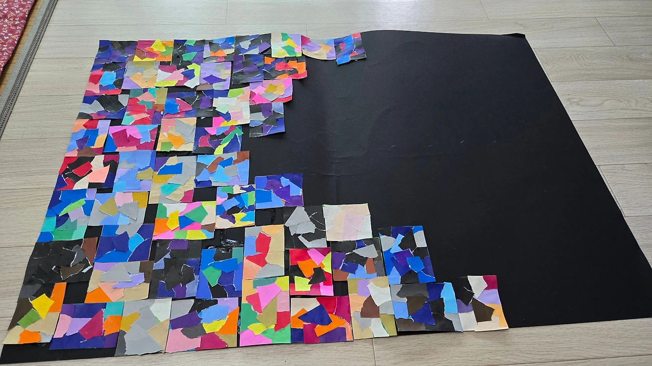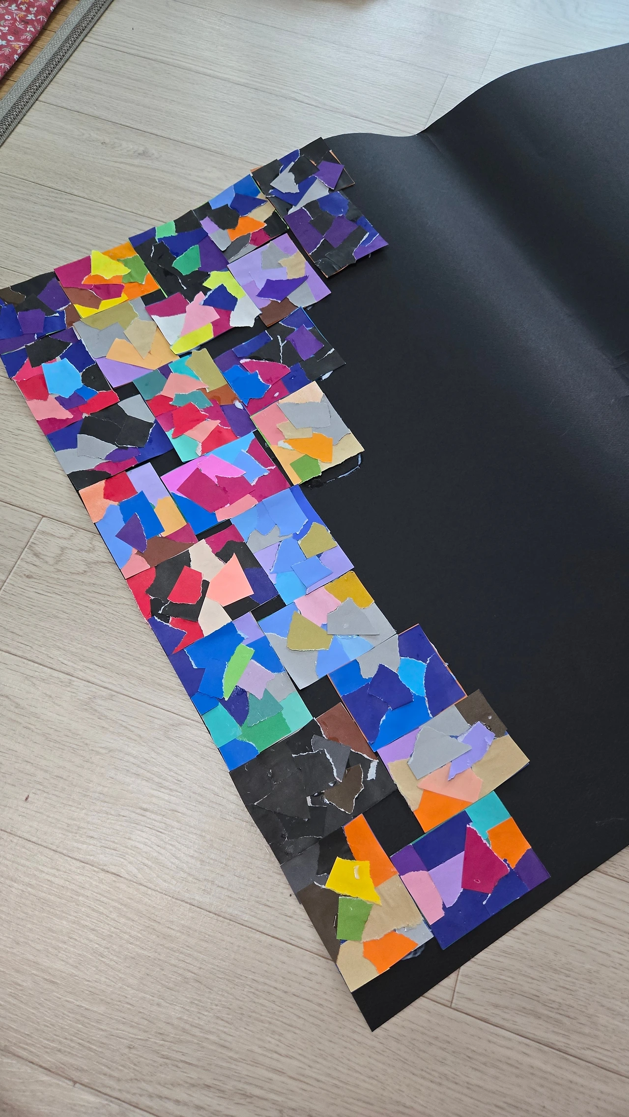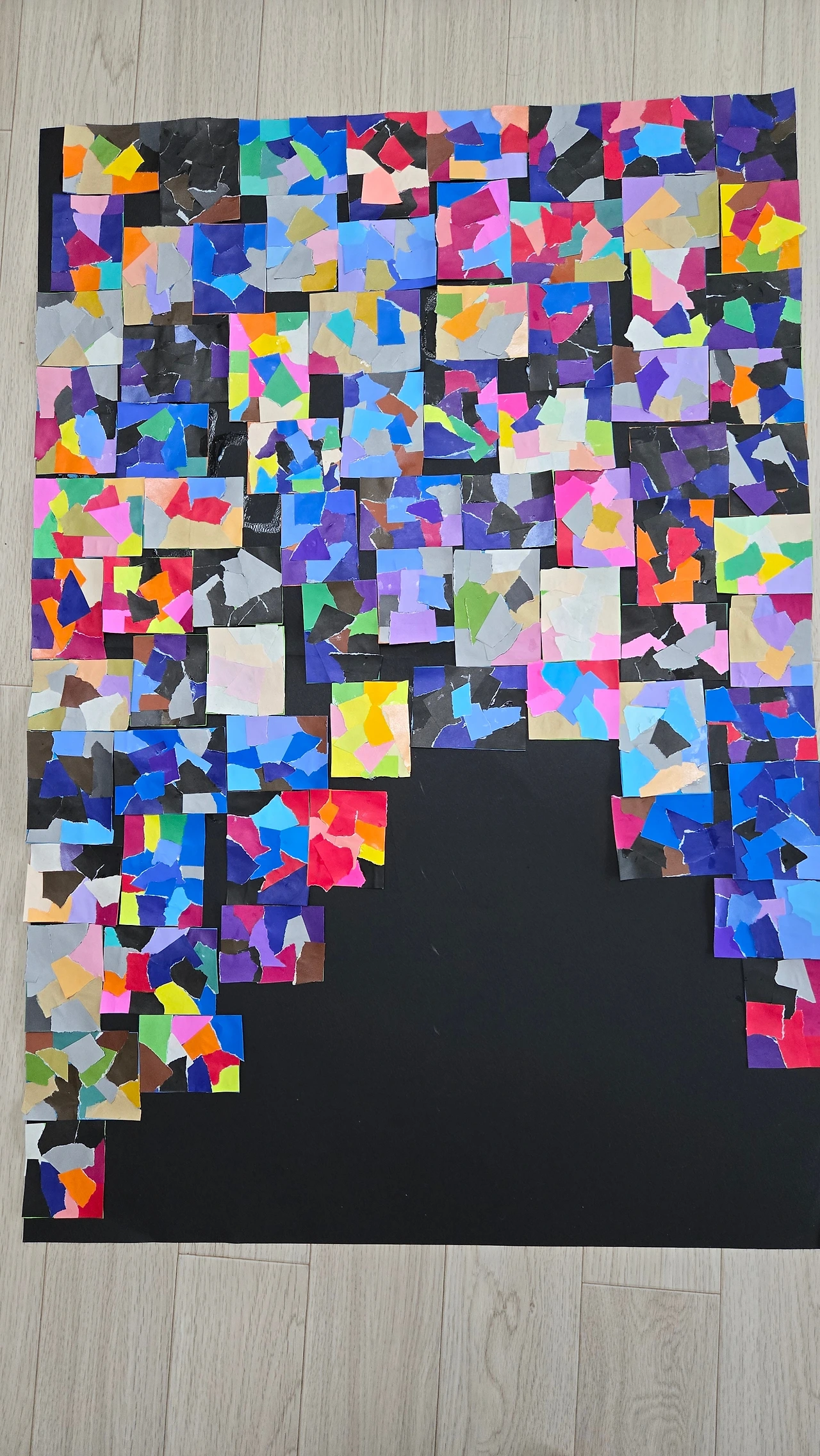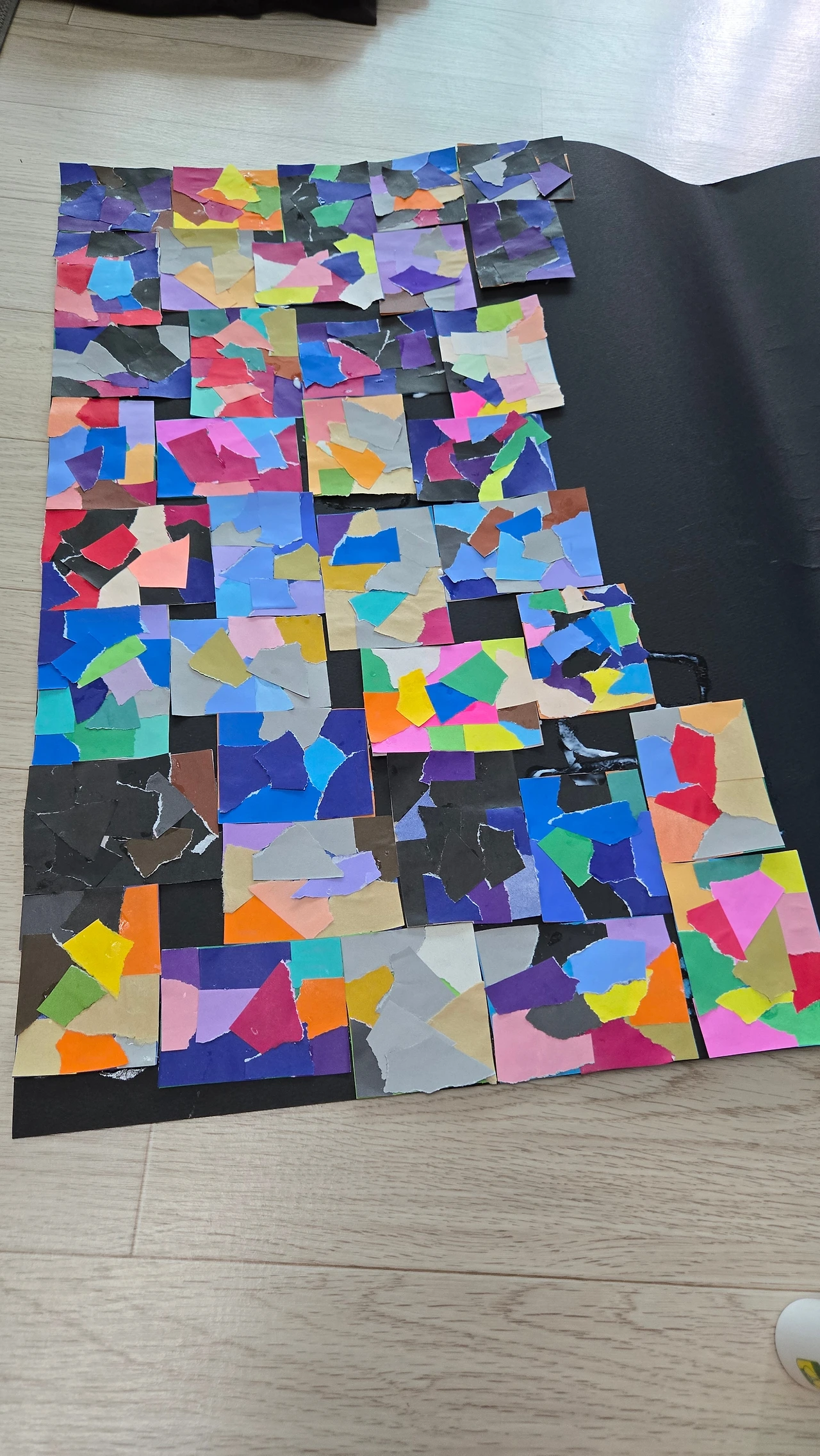 종이를 직사각형으로 자른 뒤 그 위에 찢은 색종이를 붙이는 것이었다. 챗지피티는 마구 찢으라고 했는데 나는 그러고 싶진 않았다. 대신 순간순간의 감정을 색깔로 표현하고 싶었다. 나는 매순간 느껴지는 감정을 색으로 온전히 담아냈다. 참고로 나는 미술 전공도, 미술감각이 있는 사람도 아니다. 그냥 내가 느끼는대로 찢고 붙였을 뿐.