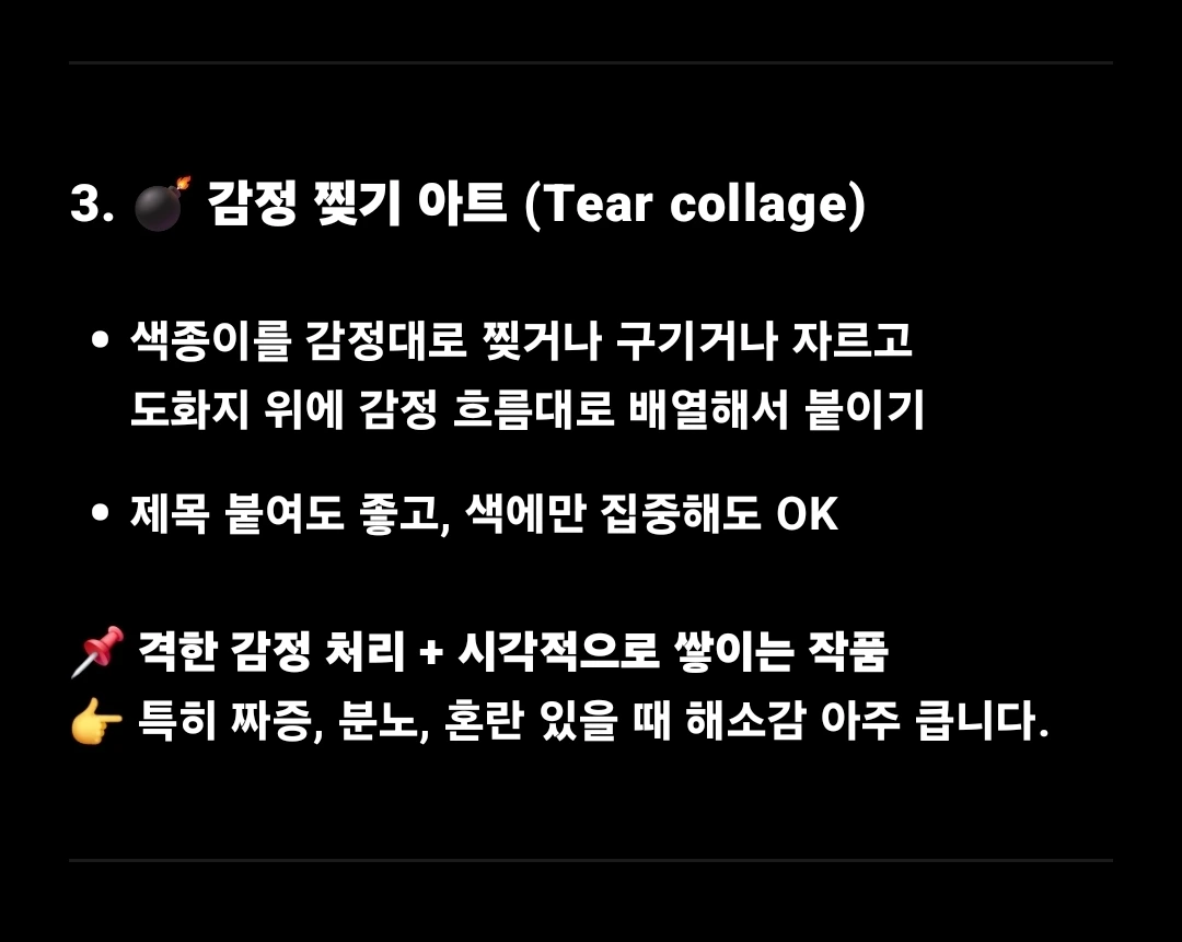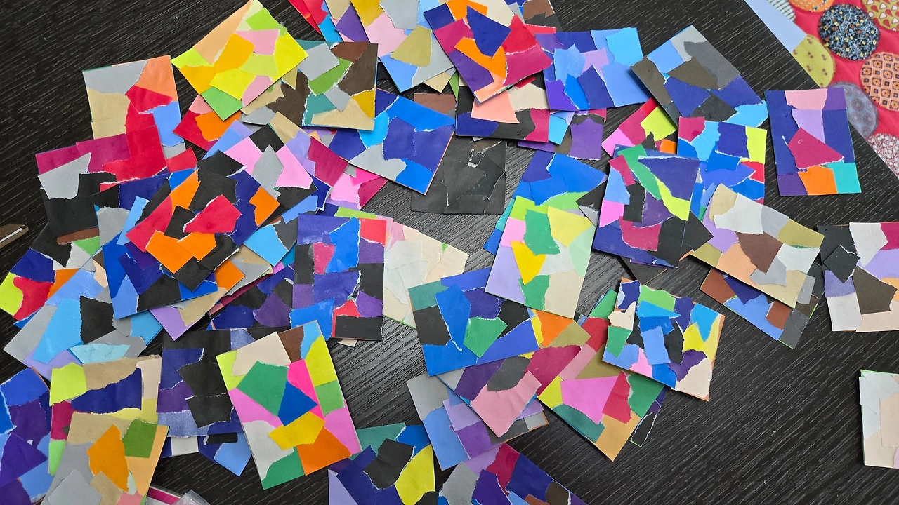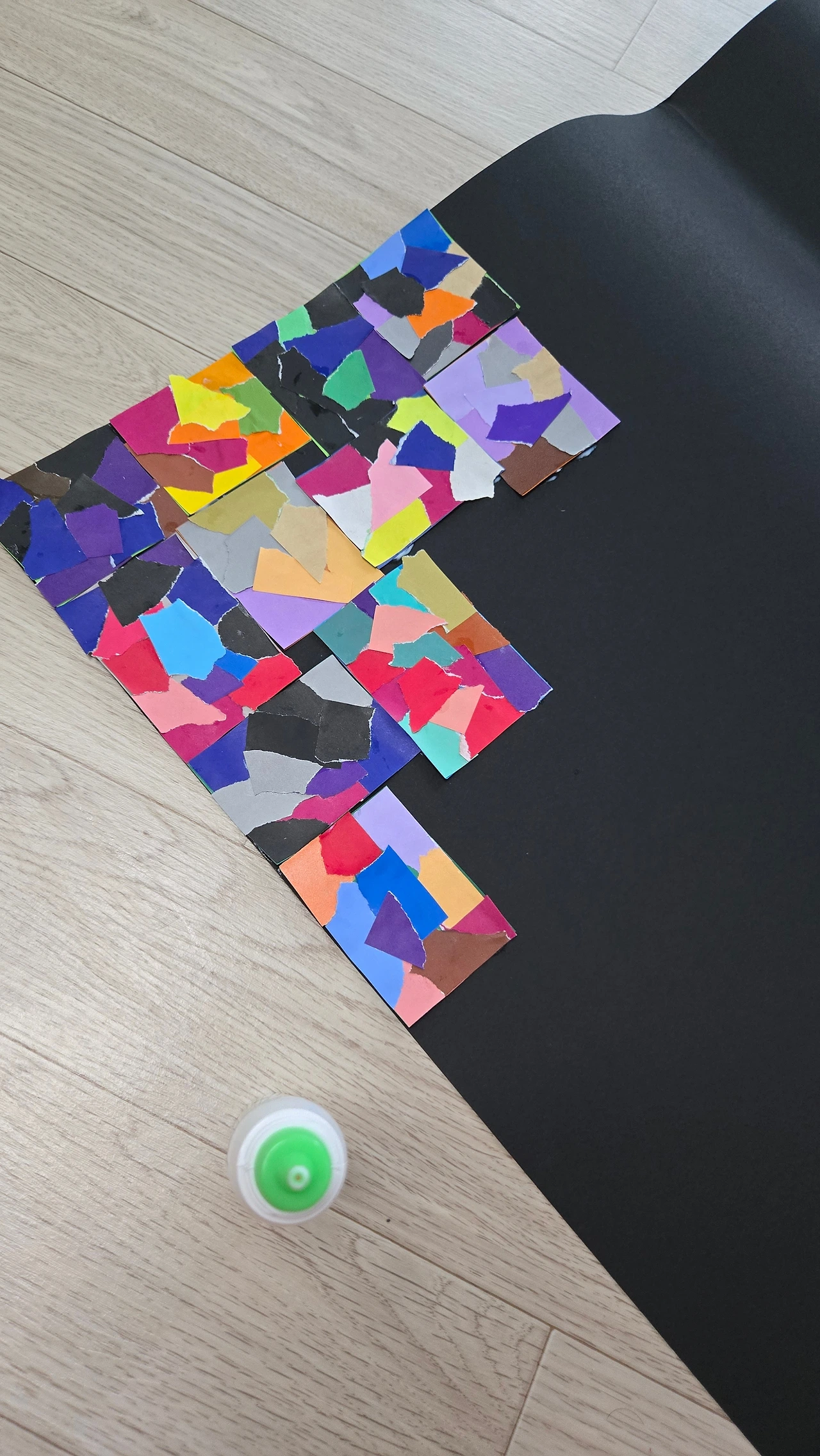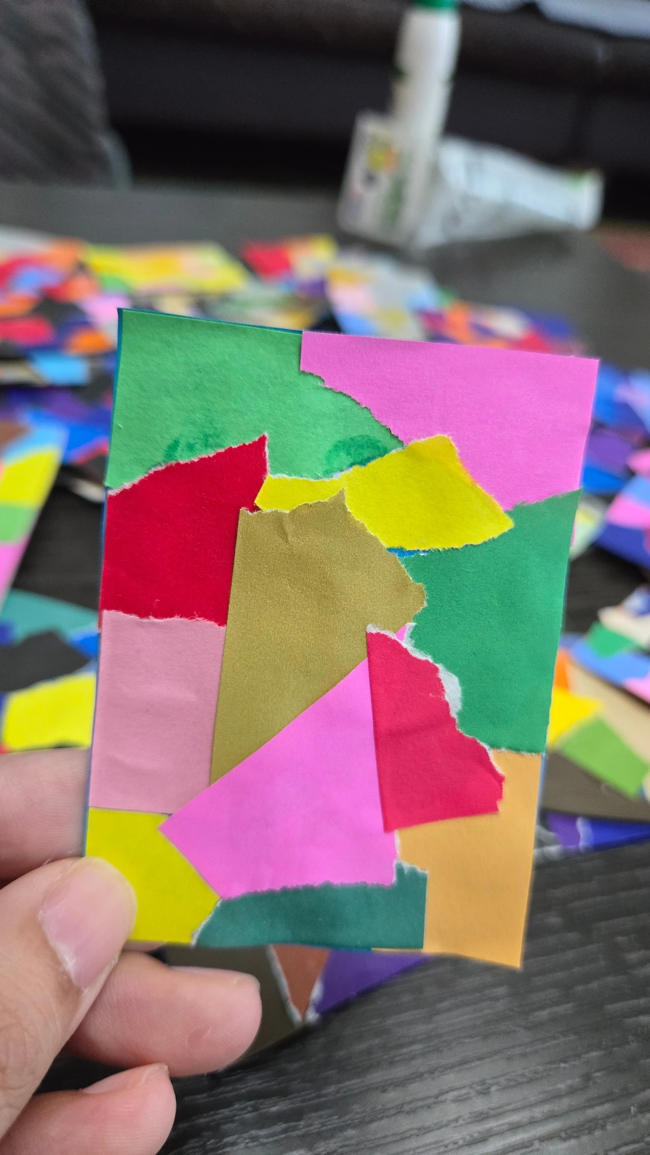 종이를 직사각형으로 자른 뒤 그 위에 찢은 색종이를 붙이는 것이었다. 챗지피티는 마구 찢으라고 했는데 나는 그러고 싶진 않았다. 대신 순간순간의 감정을 색깔로 표현하고 싶었다. 나는 매순간 느껴지는 감정을 색으로 온전히 담아냈다. 참고로 나는 미술 전공도, 미술감각이 있는 사람도 아니다. 그냥 내가 느끼는대로 찢고 붙였을 뿐.