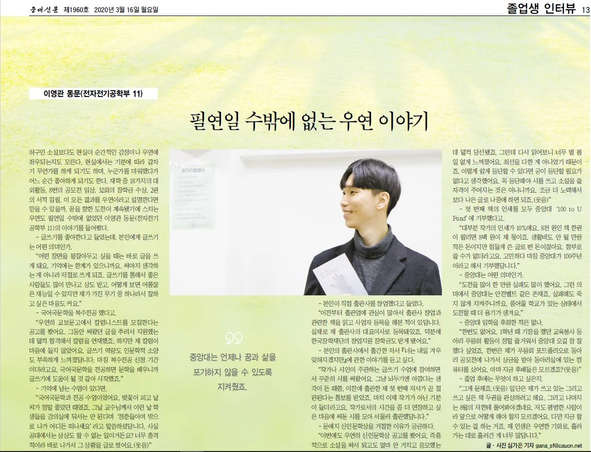그는 과학고등학교를 2학년 때 조기졸업했고 대학생 때는 5,091만 원의 장학금을 받았습니다. 2권의 시집을 쓴 시인이기도 한 A는 대학교에 입학한 뒤 20여 가지의 대외활동 참여, 10여 번의 공모전 수상을 하며 세상을 알아갔습니다. 기적과도 같은 버저비터를 꿈꾸며 지금도 기회를 만나면 기꺼이 젊음을 던지는 A. 그는 꿈과 삶을 포기하고 싶지 않아 애쓰는 작가 지망생이기도 합니다.