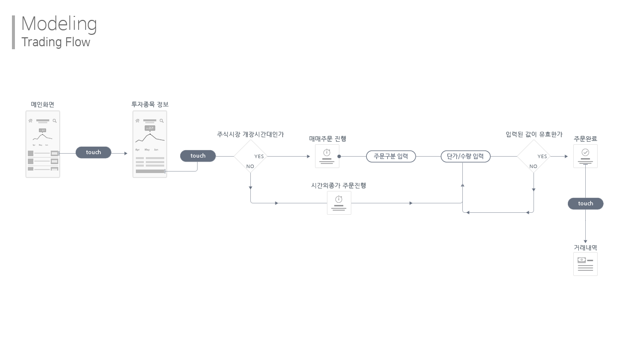 그러다 문득 해외의 로빈후드 등 간결한 UX를 적용한 트레이딩 앱을 여럿 보다가 국내에서는 왜 MTS를 이렇게 밖에 만들지 못할까라는 의문에 리디자인해보기로 결심했습니다. 지난 21일 자격증 시험을 마무리하자마자 시작해 1주일 정도 속성으로 진행한 단기 프로젝트입니다.