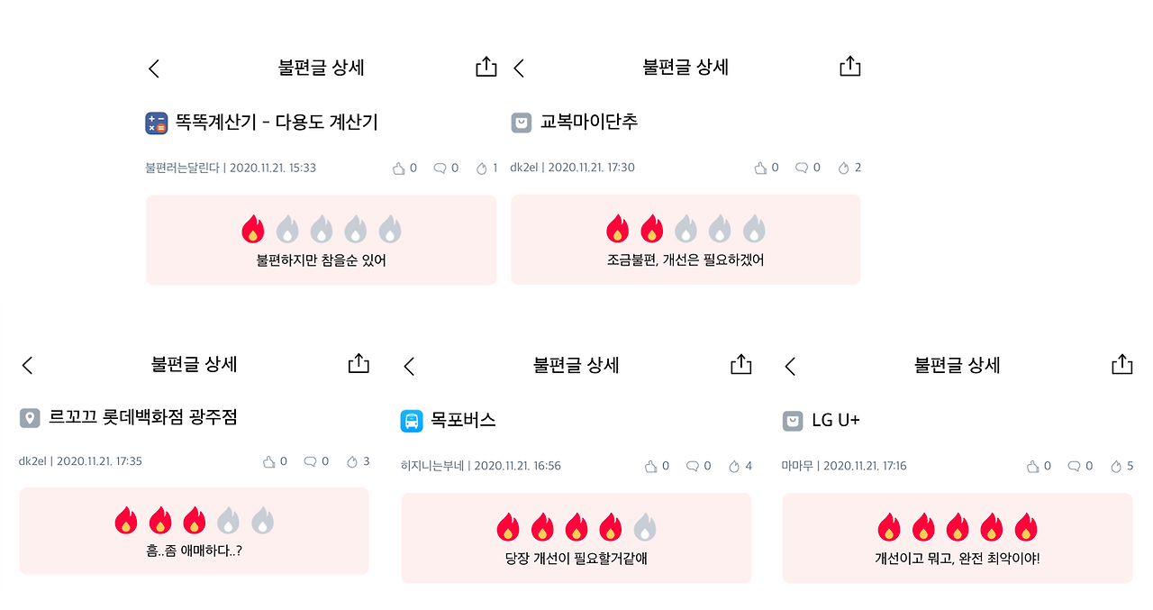 위의 사진과 같이 불편한 정도에 간략한 내용을 삽입해 사람들이 쉽게 해당 의견이 어느 정도에 해당하는지 파악할 수 있도록 제시했습니다. 이렇게 평점 객관화를 할 수 있는 요소를 심어놓아 사람들이 객관적으로 수치를 쉽고 재밌게 파악할 수 있도록 한 점이 참신하다고 생각했습니다.