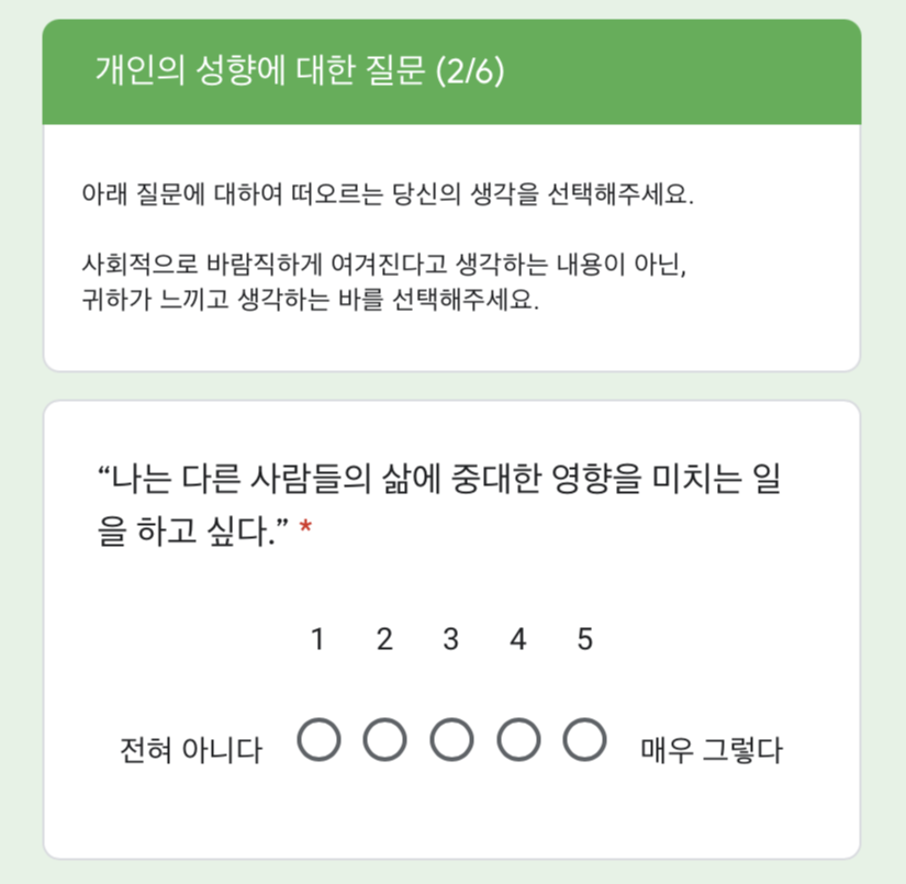 왜 그랬을까요? 그 이유는 바로 주관적인 저의 생각을 숫자로 나타낼 때 어느 정도의 수준인지 파악하기 어려웠기 때문이었습니다. 위의 설문조사에서 중대한 영향을 미치는 일을 하고 싶은 정도를 '매우 그렇다'와 '그렇다'를 두고 고민을 많이 하고 있었던 것이죠. 한편 '보통'은 도대체 어떤 의미일까요? 이도저도 아닌 것이 보통인지 아니면 아니다와 그렇다 사이에서 고민하는 것이 보통인지 헷갈리지 않으신가요?
