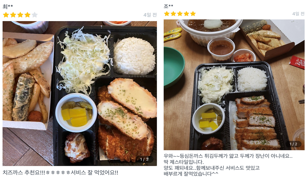 또 다른 사례를 들어볼게요. 위의 사진은 같은 음식점에 남겨진 후기입니다. 왼쪽과 오른쪽 내용을 보시면 두개의 후기 모두 맛있다는 내용이지만 별점은 4개와 5개로 다릅니다. 이렇게 사람마다 공통된 의견이어도 다른 별점을 표시하는 경우에는 후기를 보는 우리들의 입장에서는 어떻게 판단해야 할까요?