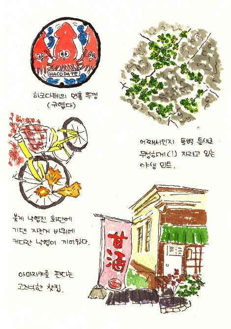 아침부터 그림 도구와 카메라를 짊어지고 관광을 나선 우리는 아카렌가 창고 광장 중에서도 목조 건물에 자리한 스타벅스에서 원기를 충전하고서 파카 주머니에 손을 찔러 넣고 딱히 길 잃을 걱정이 없는 격자 모양 거리를 따라 발 닿는 대로 하치만자카 언덕길을 오르기 시작했다. 전형적으로 생활감은 떨어지지만 눈 닿는 곳마다 그림처럼 아기자기한 관광지였다. 추적추적 내린 비에 젖은 낙엽이 콜라주처럼 달라붙은 계단도 예쁘고, 아래층은 일본식이고 위층은 서양식인 묘한 느낌의 건물 사이로 장미 송이가 엿보이고, 어째서인지 돌담 틈새로 민트가 싱싱하게 피어 있었다. 뒤를 돌아보면 바다가, 앞을 올려다보면 파스텔 톤의 푸르고 노란 공회당이 언뜻 보였다. 이쯤 되면 그림 여행으로 최적인 곳 같지 않은가?
