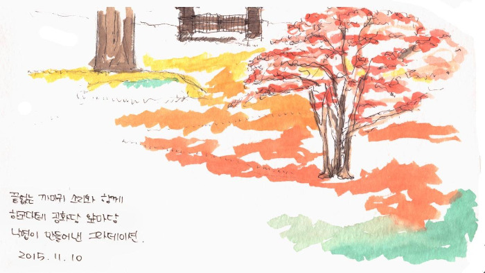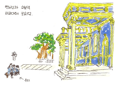 그럼에도 결론부터 말하자면 그림 여행은 반쯤 실패로 돌아가고 말았다. 눈 돌아가는 곳마다 예쁘고 신기한 탓에 두 웹툰 작가를 포함한 모두가 쉴 새 없이 카메라로 자료사진을 남기기에 바빴기 때문이다. 스마트 기기의 폐해! 디지털화되고 마는 추억들! 색 바랠 일도 없는 바이트로 이루어진 사진들! 하지만 여기까지 들고 온 그림 도구를 무용지물로 만들 수 없었던 우리는 사명감을 가지고 앉아서 그림을 그릴 만한 곳을 찾아냈다. 언덕길 꼭대기 즈음에 버티고 선 구 하코다테 구 공회당 건물 앞의 작은 벤치였다. 서양풍으로 지은 2층짜리 목조 건물로 푸른색 바탕에 노란 창문이 어우러지고, 작은 정원 바닥에는 각기 다른 색으로 물든 낙엽이 떨어져서 생긴 그라데이션이 선명했다. 시간도 거의 저녁에 가까워져서 마치 우리에게 주어진 마지막 기회 같았다. 벤치에 옹기종기 앉은 우리는 각자 스케치북을 꺼내서 마음 가는 대로 드로잉을 남겼고, 그림 대신 사진에 취미가 있는 친구는 우리가 마치 평생 동안 그림 여행만 다닌 사람처럼 보이는 사진을 찍어줬다. 확대 해석을 조장하는 증거 남기기에도 손발이 딱딱 맞는 사이인 셈이다. 여하튼 이렇게 여행길에서 그림 한 장은 무사히 남겨올 수 있었다.