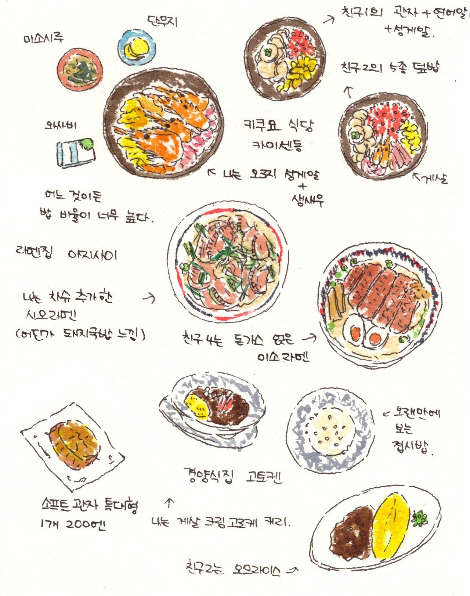그뿐인가? 기본적으로 강제 메뉴 통일 없이 겹치면 겹치는 대로, 전부 다른 거 먹고 싶다면 또 그러자는 대로 주문하는 사람들이라 어딜 가든 궁금한데 내가 사 먹을 것까지는 아닌 음식을 먹는 친구가 꼭 하나씩은 있다. 라멘집 '아지사이'에서 내가 시오 라멘을 먹으며 이건 너무나 내 고향 부산의 돼지국밥 냄새라고 생각하고 있을 때 친구 1은 달콤한 소스를 끼얹은 바삭바삭한 돈가스를 올린 미소 라멘을 먹고 있었다. 산책 끝에 발견한 경양식집 '고토켄'에서는 통통한 정통 오므라이스와 일본풍 소스를 끼얹은 햄버그 스테이크를 구경하면서 게살 크림 고로케를 얹은 고토켄 특선 커리를 먹었다. 아사이치 시장에서 반드시 먹어야 한다는 해산물 덮밥을 찾아 '키쿠요 식당'에 들어갔을 때는 과연 얘들이 뭘 주문할지 진지하게 궁금해지기 시작했다. 단무지에 미소시루, 해산물 덮밥이라는 단순한 구성 때문에 오히려 각자의 성격이 드러나기 쉽기 때문이다. 과연 어떤 해산물을 몇 개나, 어떤 조합으로 얹을 것인가? 좋아하는 것만 잔뜩 먹기 위해 고심하다 성게알과 생새우만 고를 것인가, 좋아하는 관자와 성게알에 왠지 궁금한 연어알을 추가할 것인가, 이왕이면 화려한 6종 세트로 전부 하나씩 먹을 것인가? 내가 확실하게 맞출 수 있었던 건 어쨌든 똑같은 걸 시키는 사람은 하나도 없을 거라는 것뿐이었다.
