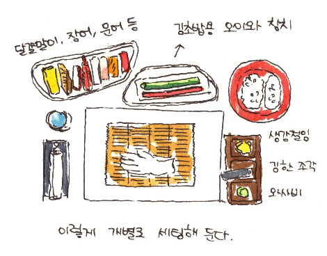 평소에 보던 초밥 장인의 손은 워낙 빨라서 관찰하기 힘들었는데, 밥에 네타를 올리고 살짝 누른 다음 모양을 잡고 뒤집어서 다시 누르는 등 과정이 생각보다 복잡하다. 처음부터 척척 초밥을 쥘 수는 없으니 시연을 멍하니 보면서 한 단계씩 따라 하다 보면 그런 생각이 든다. 네타가 뜨끈뜨끈해지고 있군. 어느새 체온만큼 따뜻해진 초밥이 완성된다.