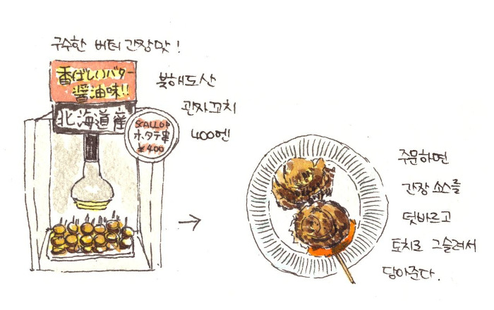 물론 가쓰오부시가 생선 인지도 몰랐던 외국인에게 날씬한 벽돌처럼 생긴 말린 가다랑어를 가는 모습을 보고 난 후에 만난 그릴에 구운 큼직한 가리비는 돈 주고 사서 먹었다. 간장을 발라서 토치에 쓱쓱 그슬려 주는 맛이란! 시장을 한 바퀴 돌고 나서 주어진 짧은 자유시간 동안 달걀말이 가게로 돌아가서 달걀말이 샌드위치와 한 조각씩 파는 달걀말이를 사고 난 후 다 함께 지하철을 타고 긴자로 이동해 초밥 만들기를 배울 가게로 찾아갔다.