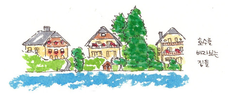 길겐 마을이 가까워질수록 볼프강 호수를 바라보며 드문드문 늘어선 집들이 늘어나기 시작했다. 호숫가에 얼마나 가까운지, 안개가 끼면 틀림없이 창문을 열자마자 방안으로 물기운이 밀려들어갈 것 같았다. 건물 벽은 부활절 달걀처럼 노르스름하고, 창문가에 제라늄이 피어 있었다.