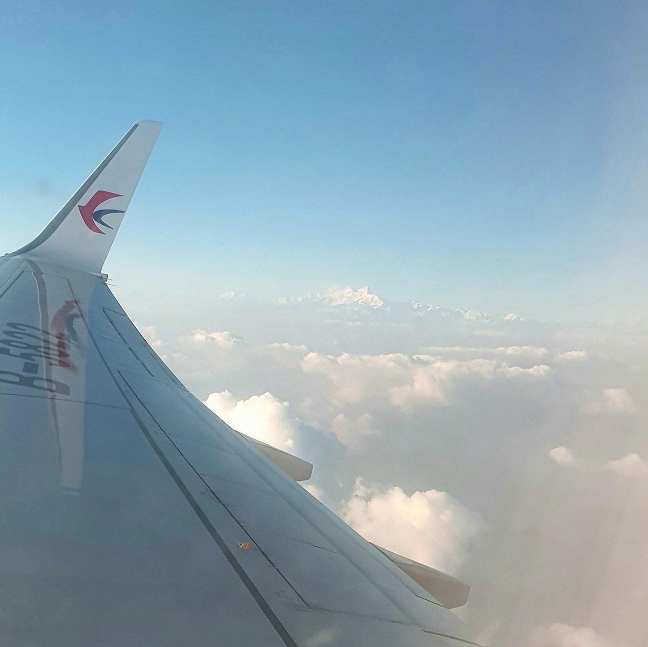 꾸벅꾸벅 졸다가 착륙 때 즘 눈을 끔뻑거리며 창문 밖을 바라보았다. 구름 위로 눈에 덮인 히말라야 산맥이 보였다. 나는 그 충격적인 풍경에 그만 잠이 달아나버렸다.
