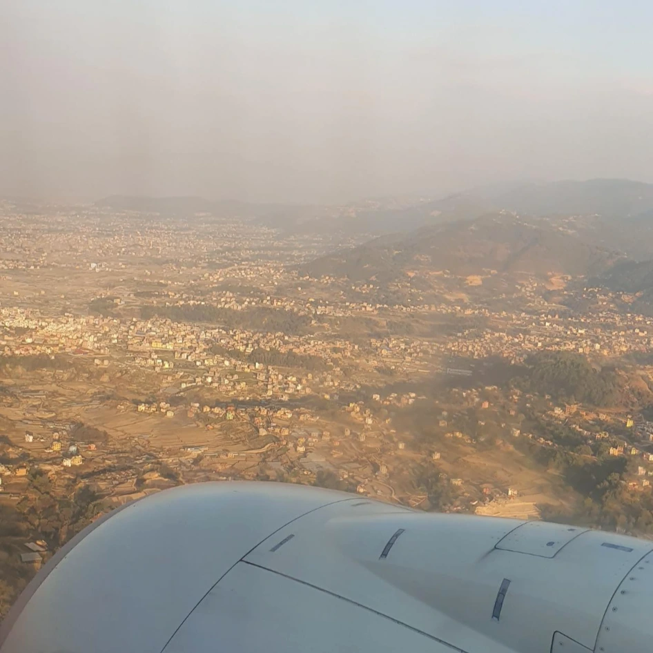 착륙하기 직전, 오후의 태양 아래 네팔의 집들이 보였다. 아시아인가, 중동인가, 헷갈릴 정도로 네모난 집들이 옹기종기 모여 있는 게 보였다. 전체적으로 노란 색감 때문에 사막 같은 느낌도 들었다.