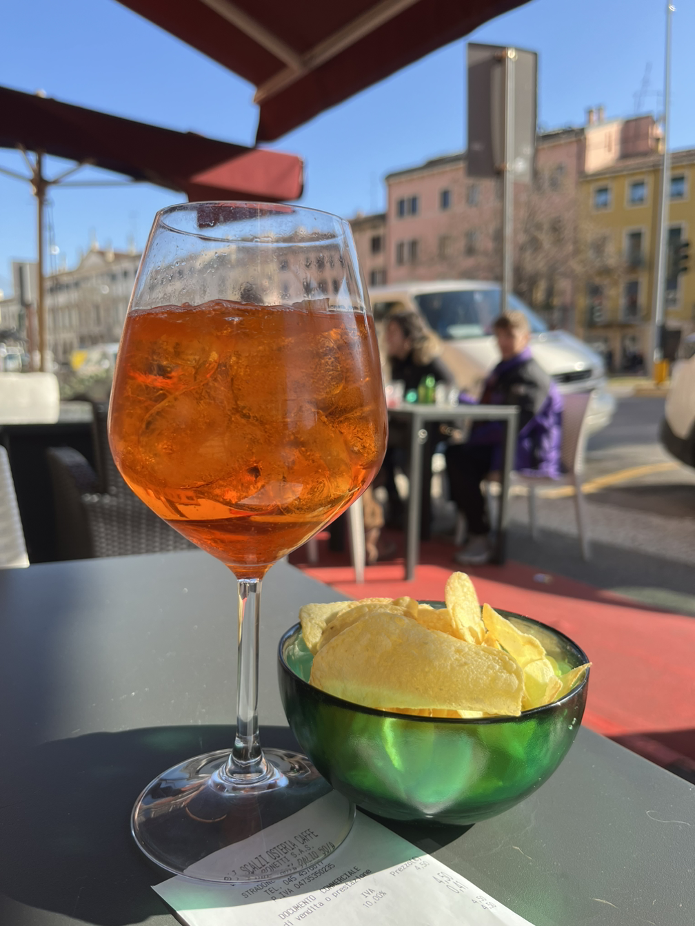 사실 이 날 아침에 가고 싶던 밥집이 문을 일찍 안 열어서 길가에 있는 카페에 들렀다. 바깥에 있는 1인용 테이블에 앉아 이탈리안 칵테일로 유명한 아페롤 스프리츠(Aperol Spritz)를 한 잔 시켰다.