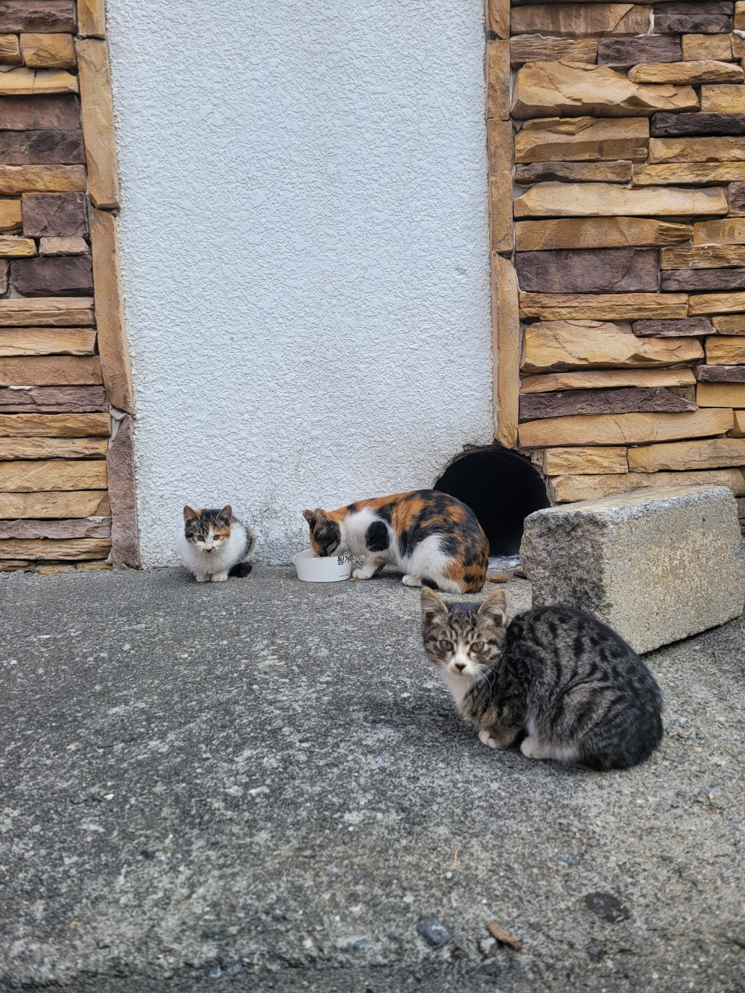 냥이 세 가족은 저기 보이는 구멍에 숨어서 밥을 먹곤 했다.